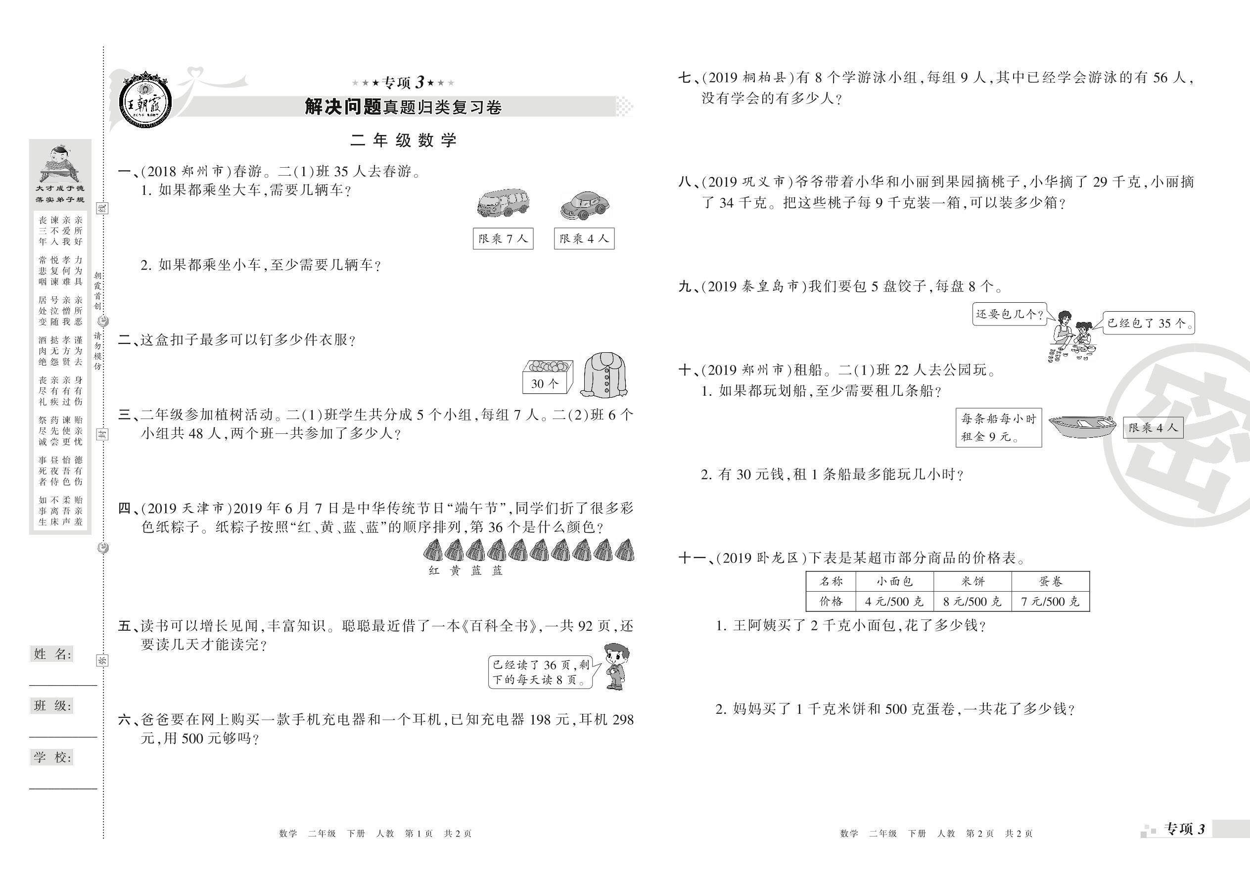 王朝霞期末专项卷——解决问题真题归类复习卷、新颖题速递:生活与数学二年级下册数学(人教版)_R21080391828【0】