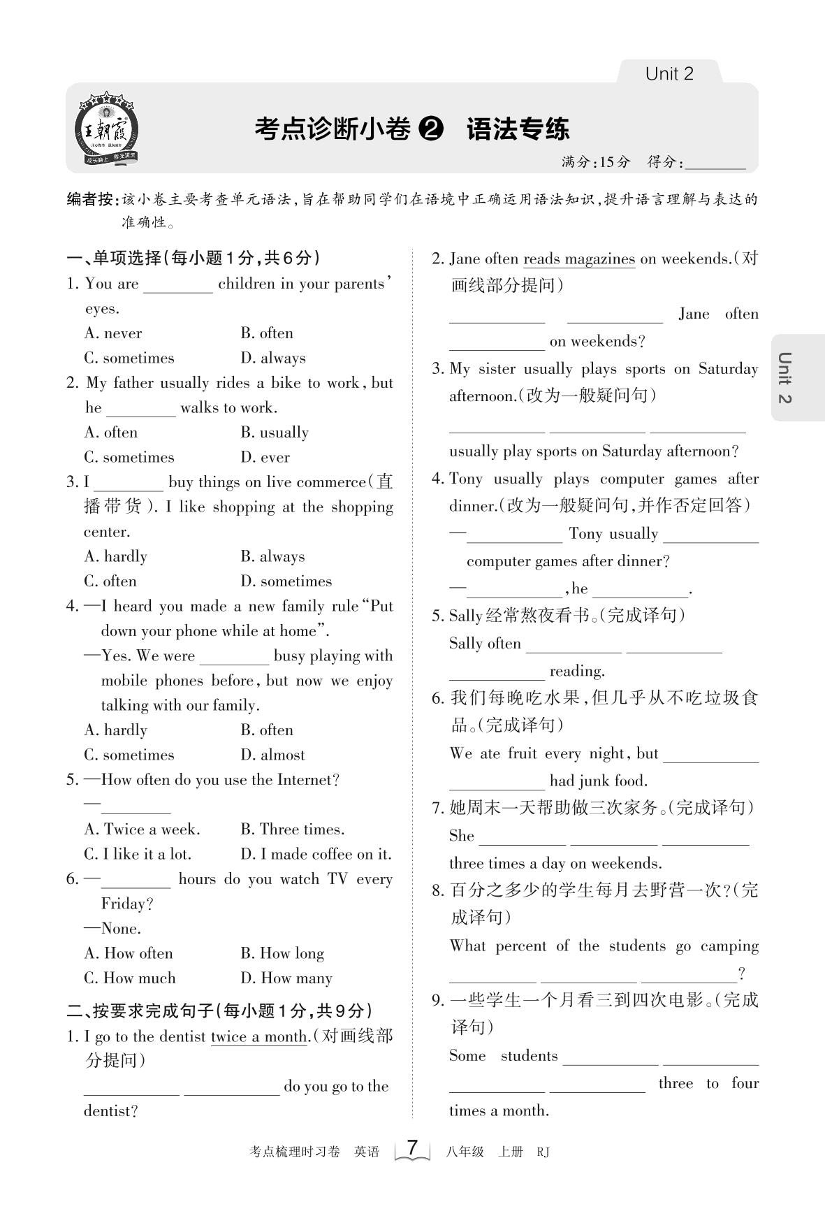 2023上册八年级英语人教版 Unit 2 考点诊断小卷2 语法专练