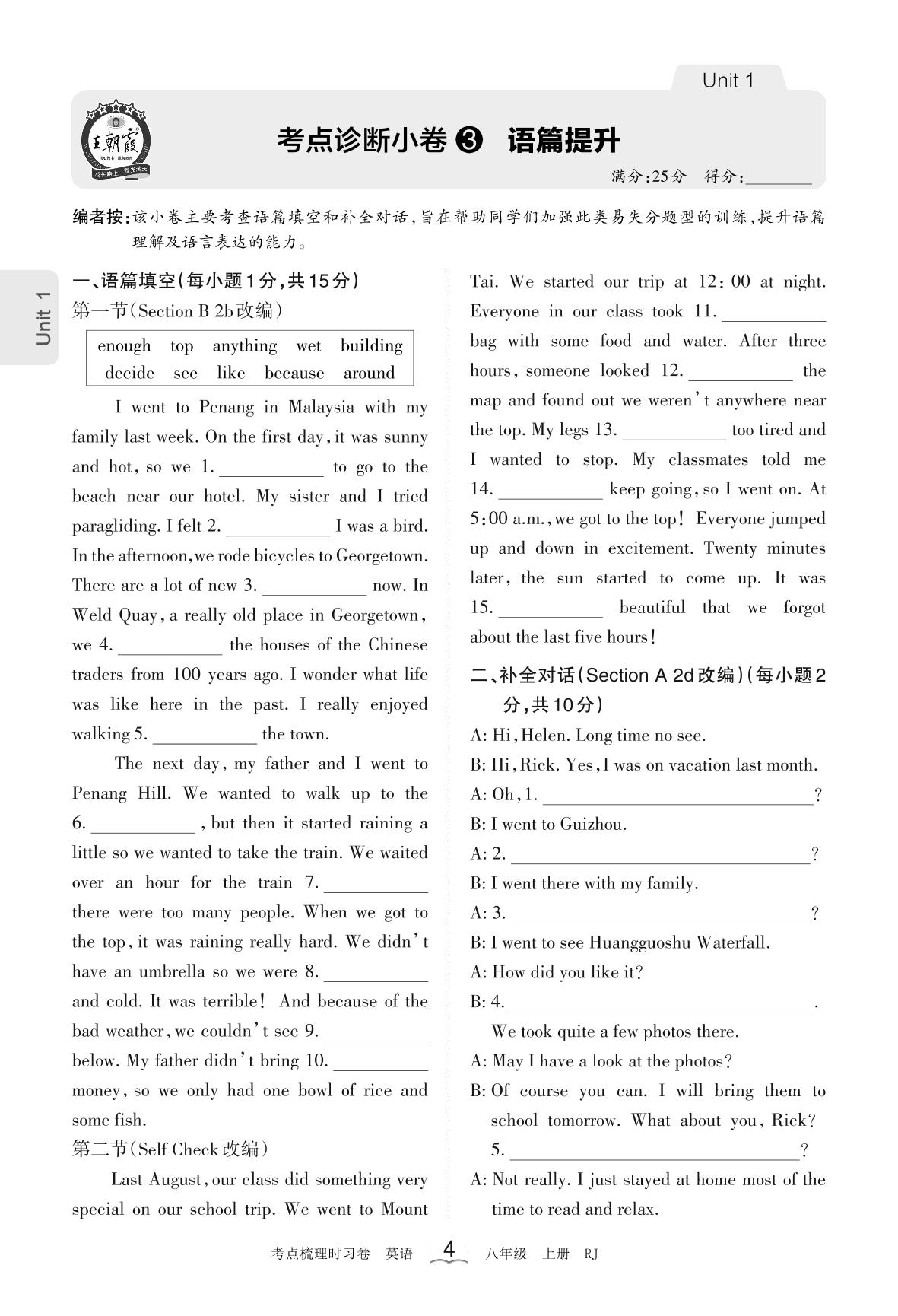 2023上册八年级英语人教版 Unit 1 考点诊断小卷3 语篇提升