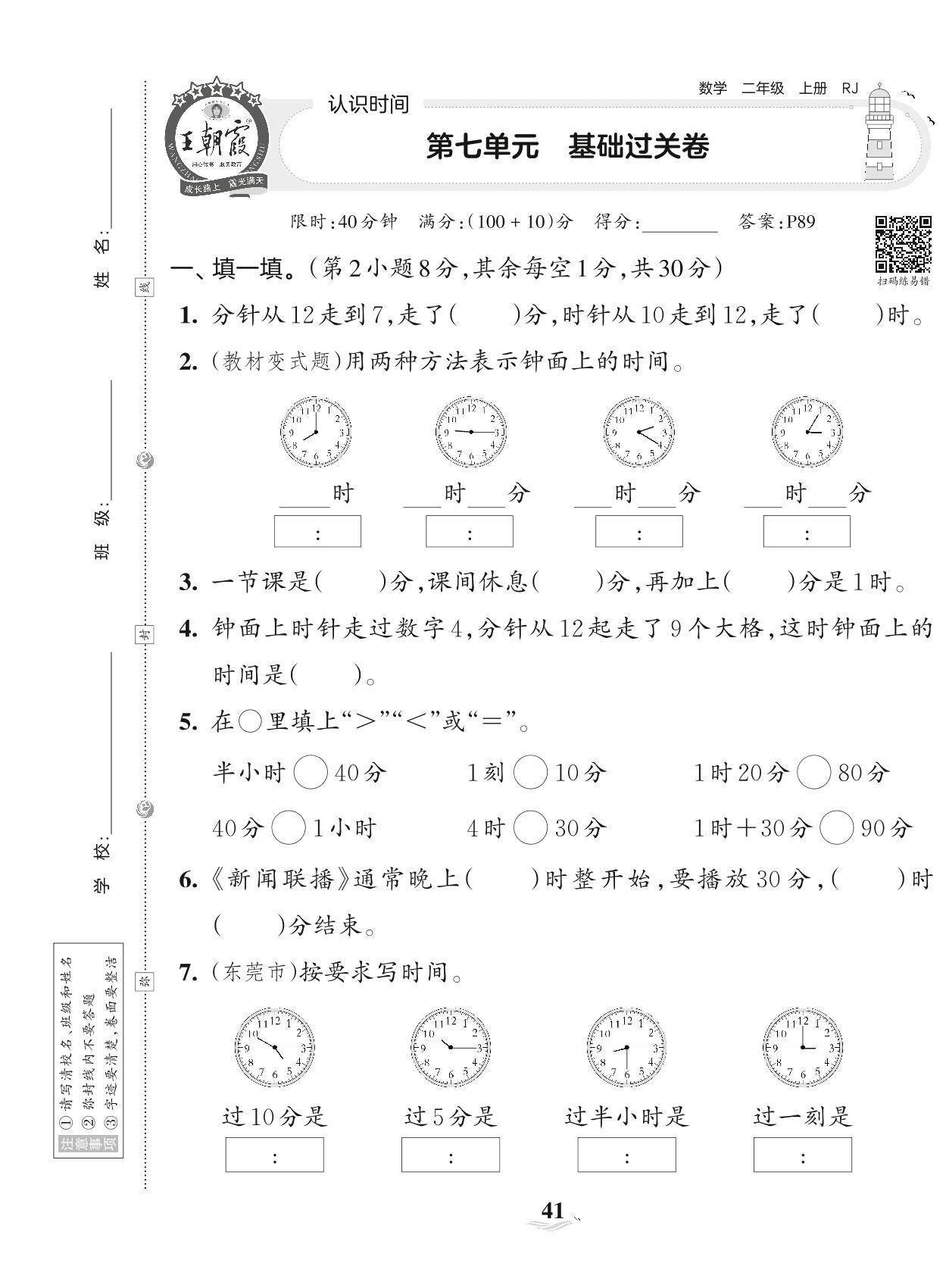 2023上册二年级数学人教版 第七单元 基础过关卷
