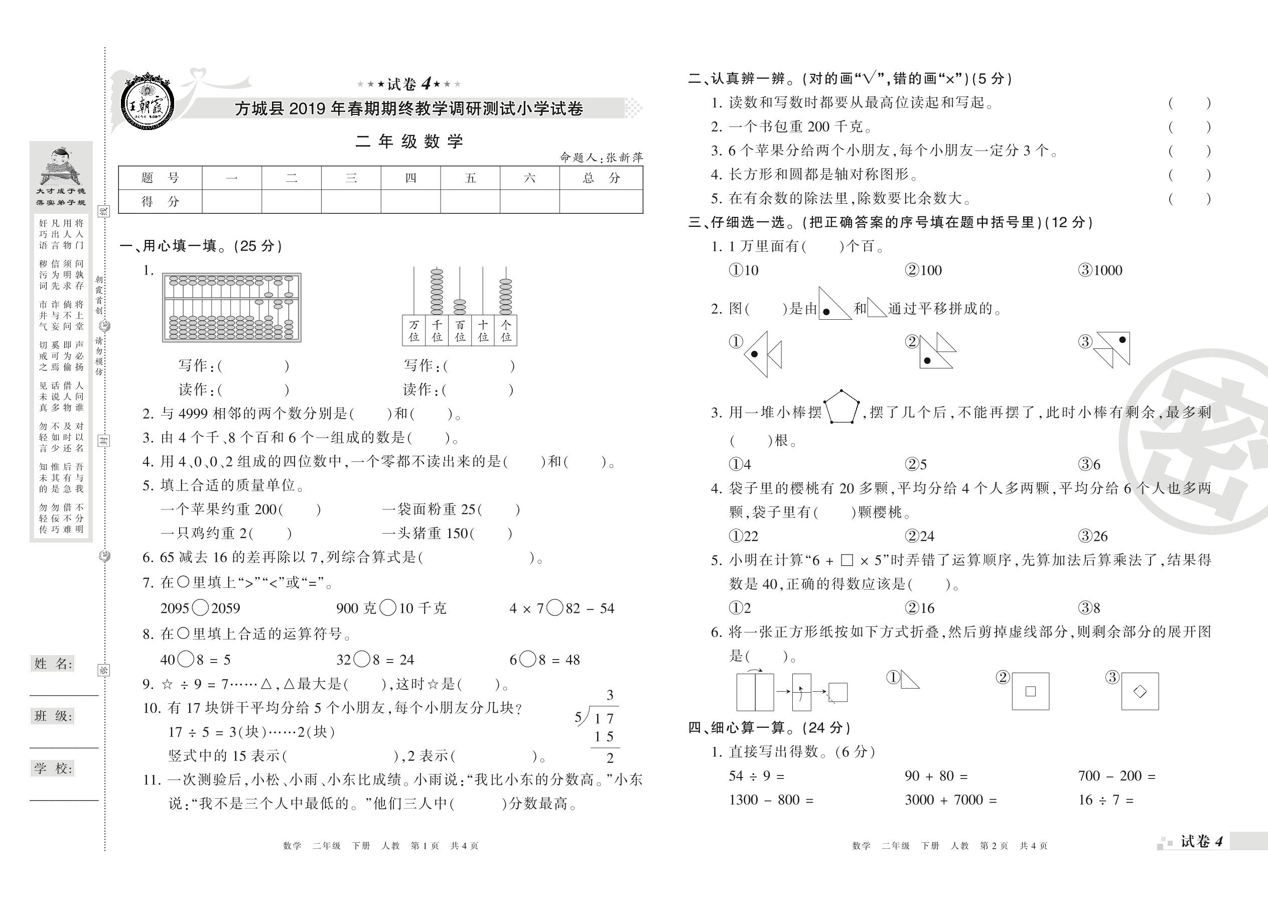 2018-2019学年第二学期南阳市方城县二年级数学试卷(人教版)【4】