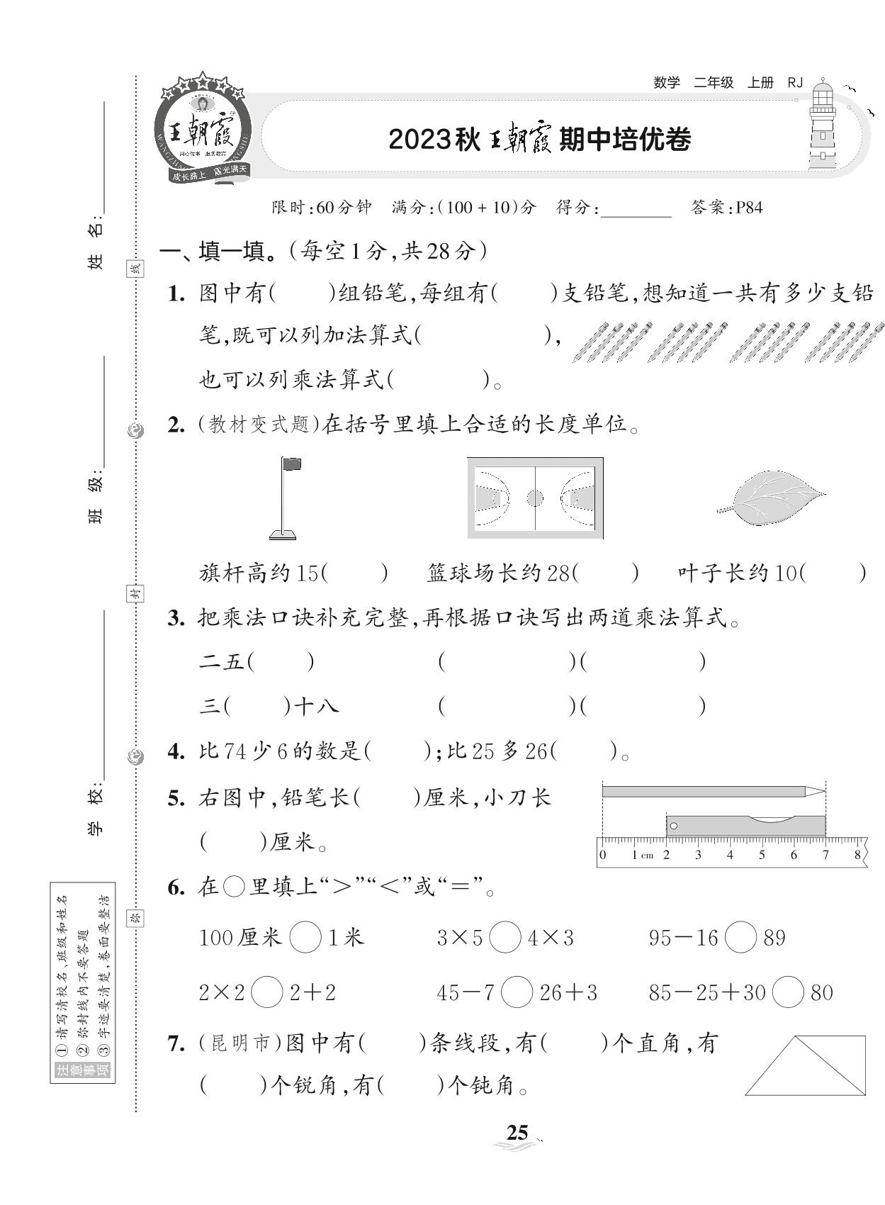 2023上册二年级数学人教版 2023秋王朝霞期中培优卷