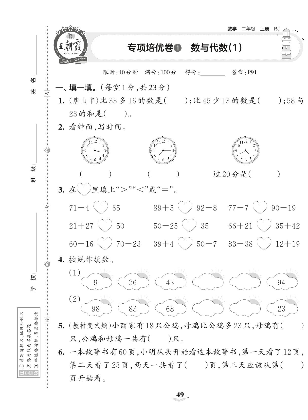 2023上册二年级数学人教版 专项培优卷1 数与代数(1)