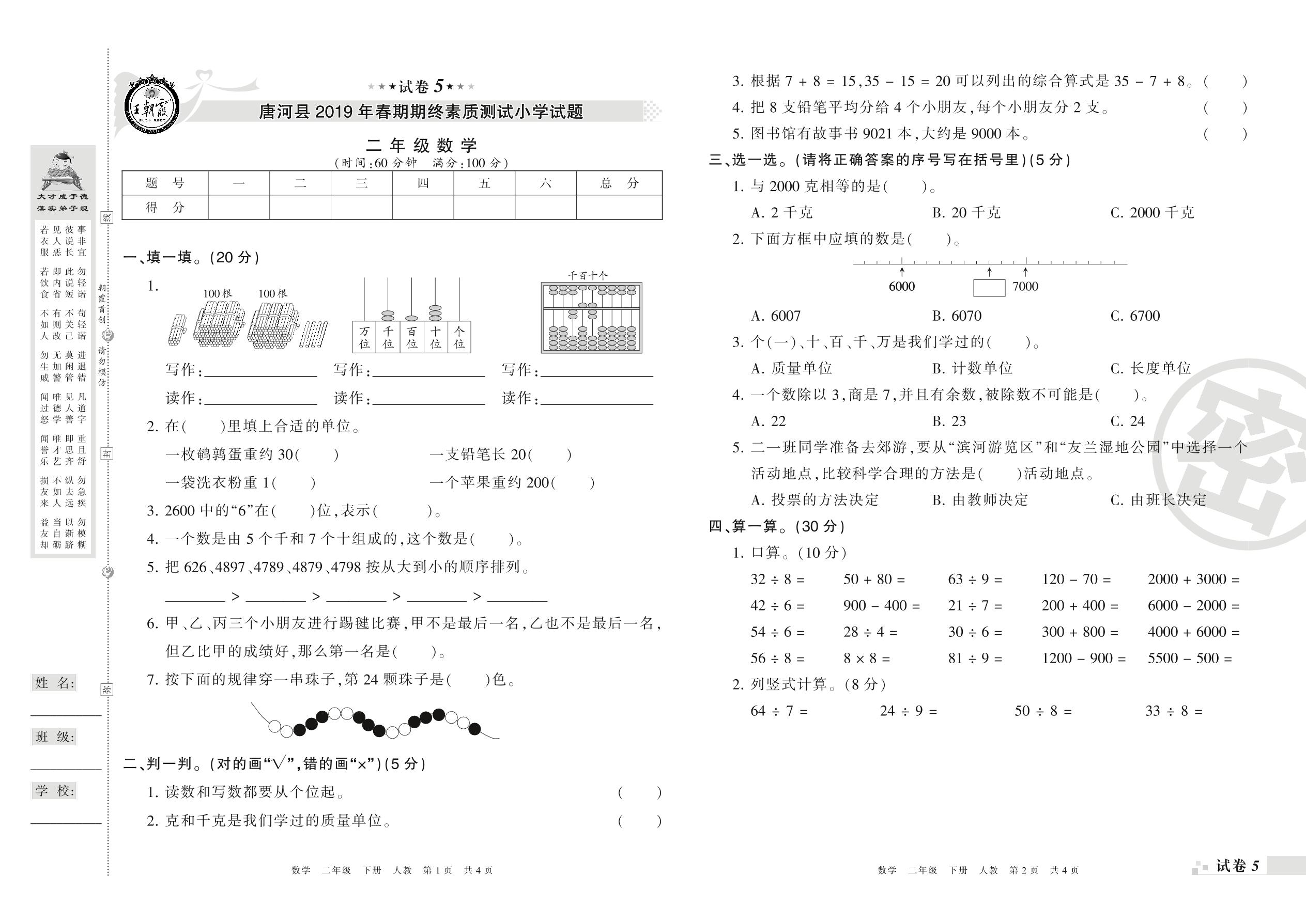 2018-2019学年第二学期南阳市唐河县二年级数学试卷(人教版)【5】