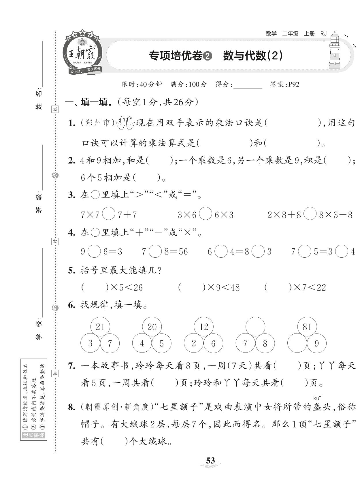 2023上册二年级数学人教版 专项培优卷2 数与代数(2)