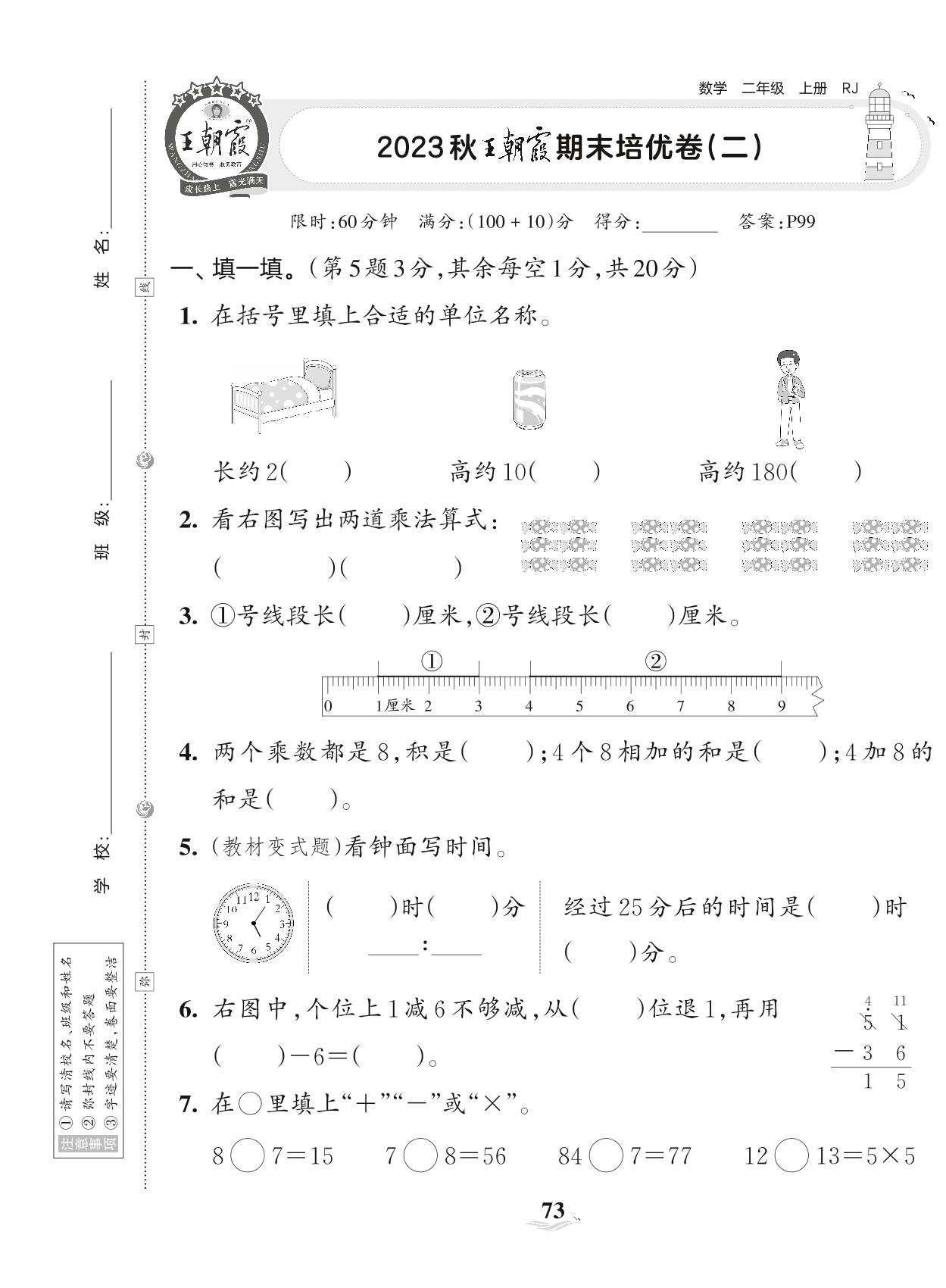 2023上册二年级数学人教版 2023秋王朝霞期末培优卷(二)