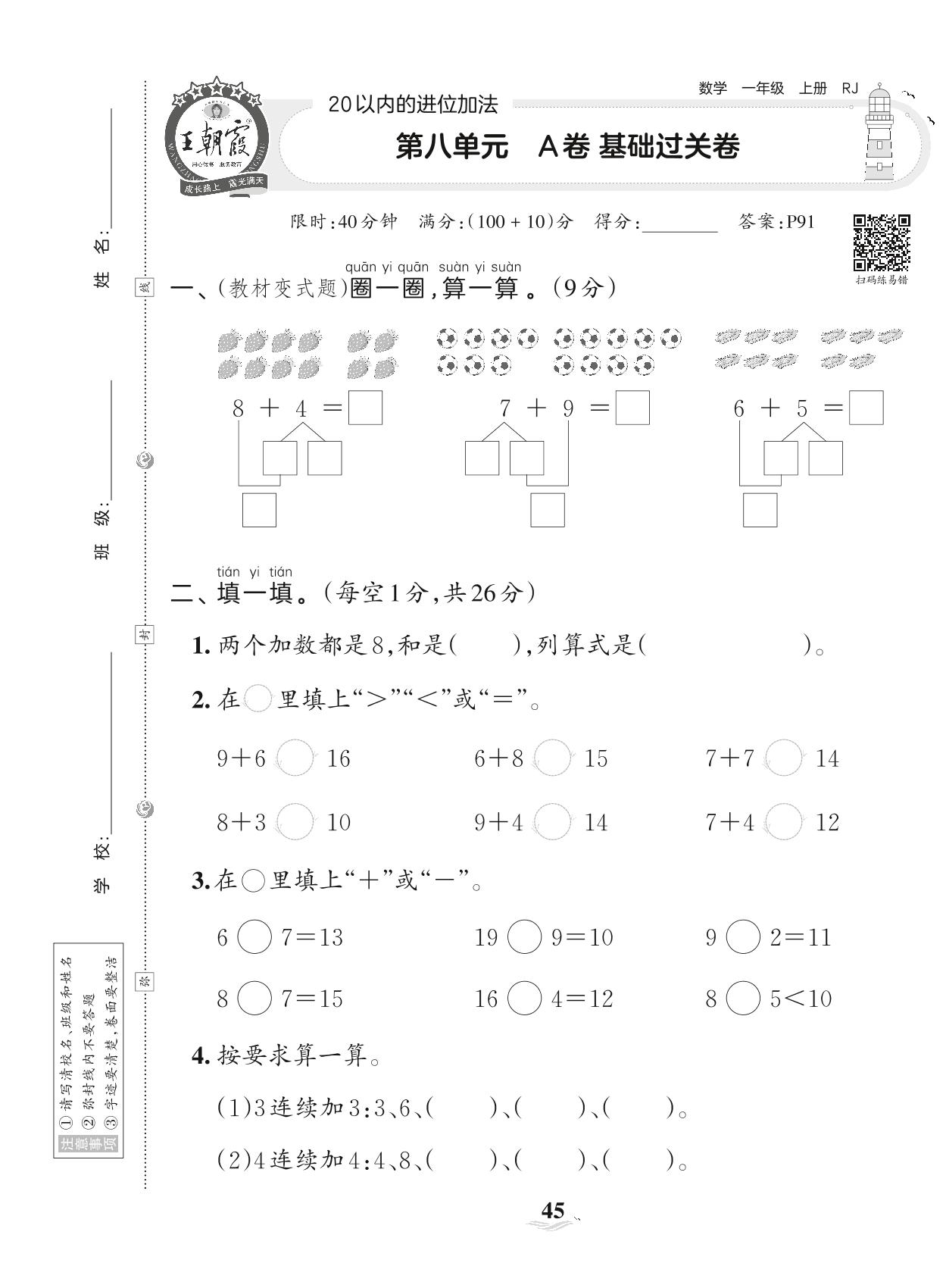 2023上册一年级数学人教版 第八单元 A卷 基础过关卷