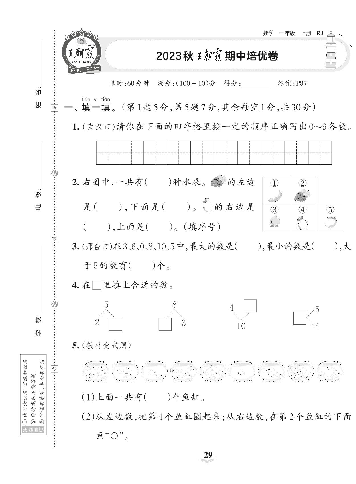 2023上册一年级数学人教版 2023秋王朝霞期中培优卷