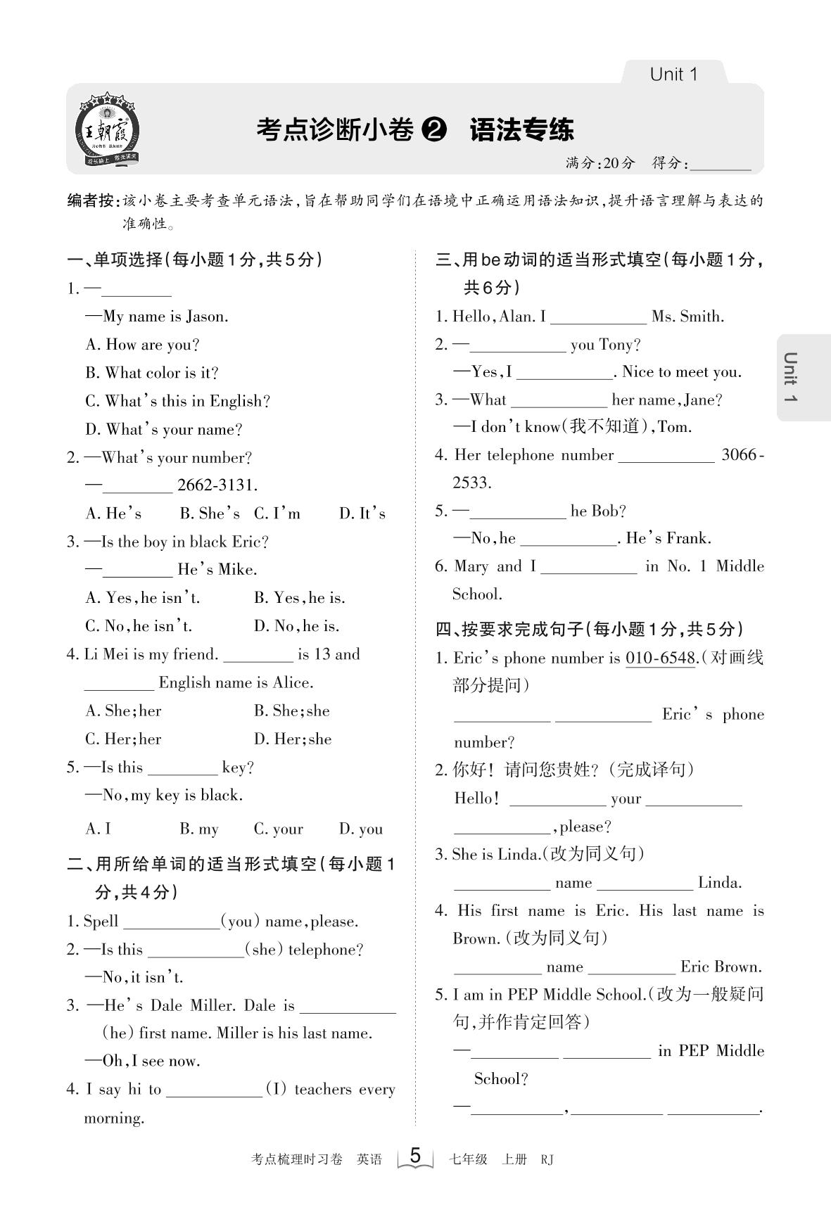 2023上册七年级英语人教版 Unit 1 考点诊断小卷2 语法专练