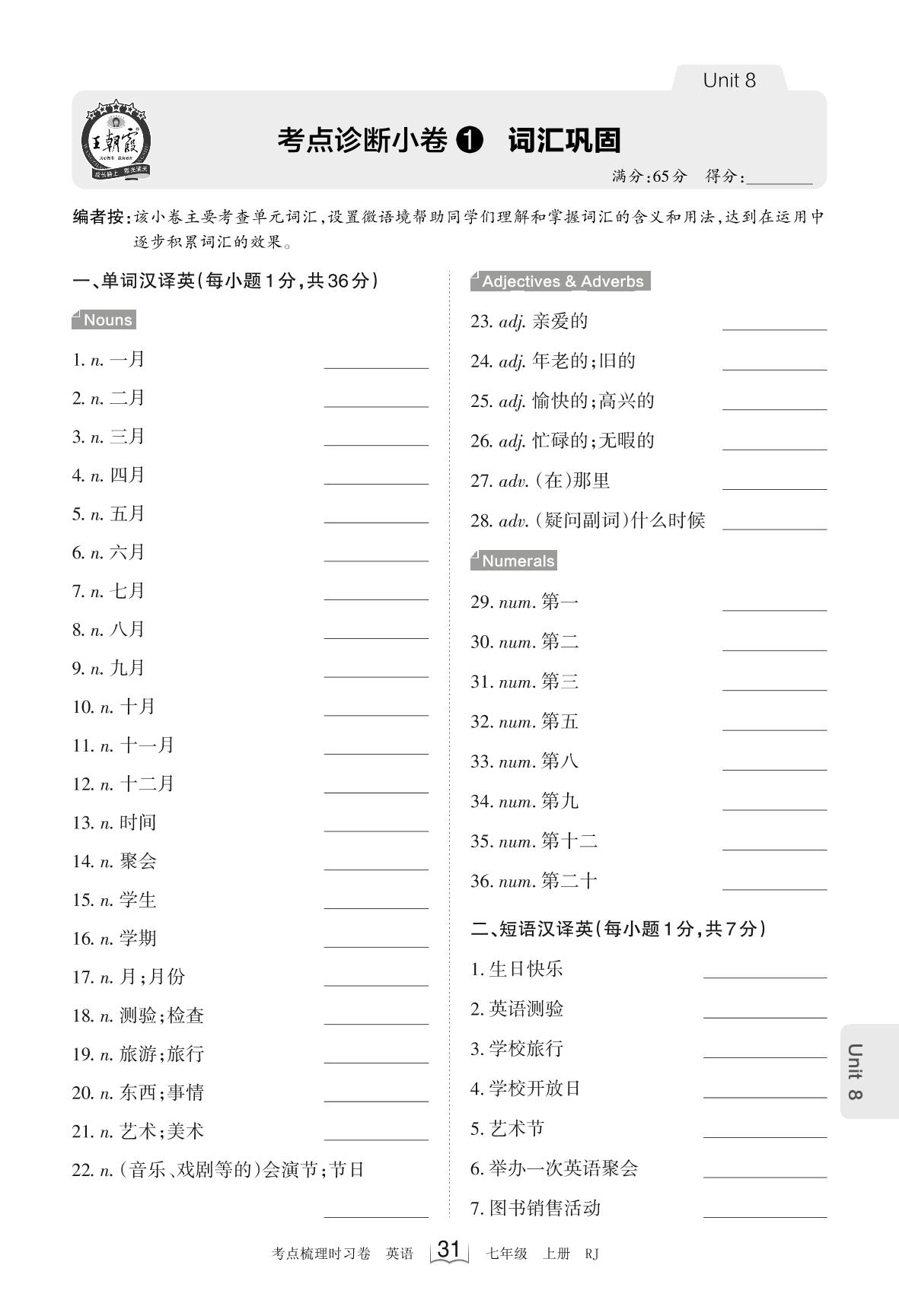 2023上册七年级英语人教版 Unit 8 考点诊断小卷1 词汇巩固