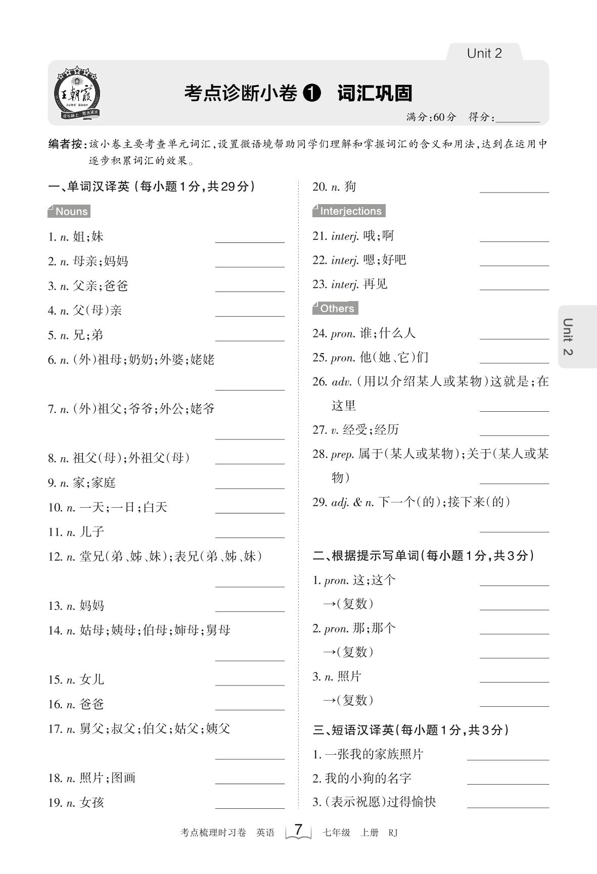 2023上册七年级英语人教版 Unit 2 考点诊断小卷1 词汇巩固