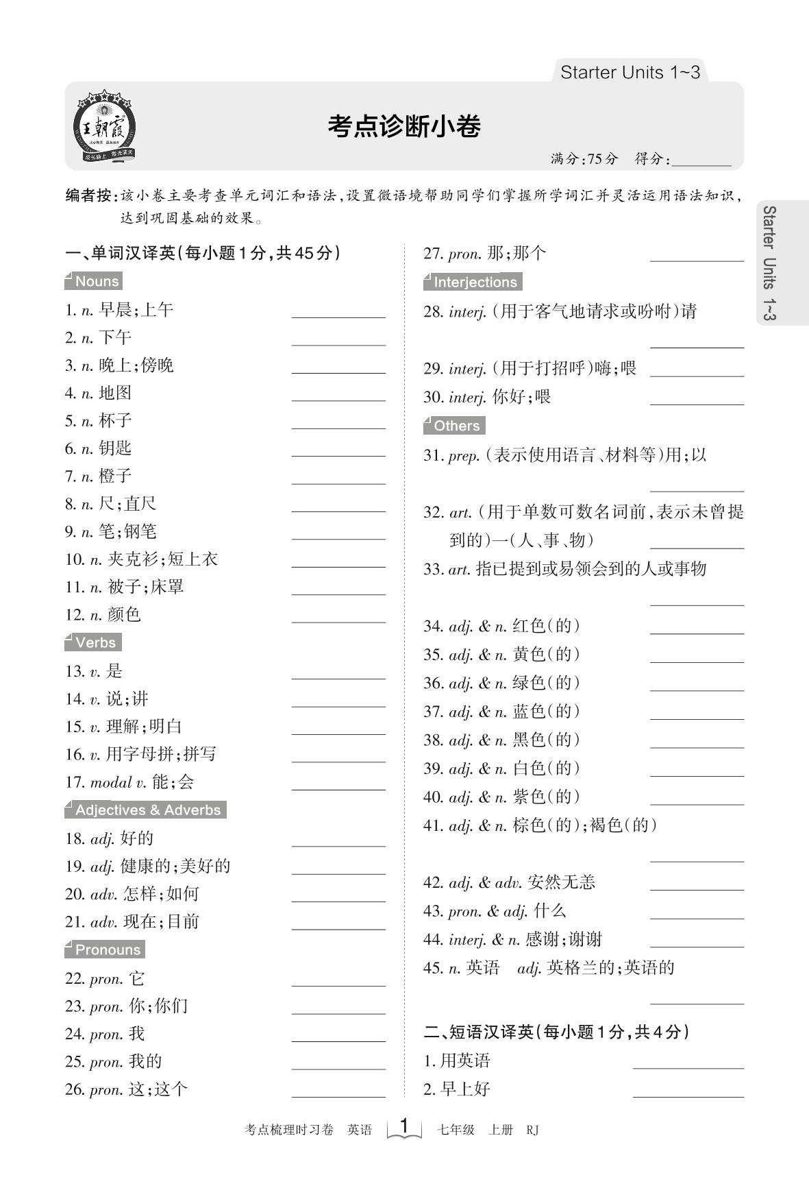 2023上册七年级英语人教版 Starter Units 1~3 考点诊断小卷