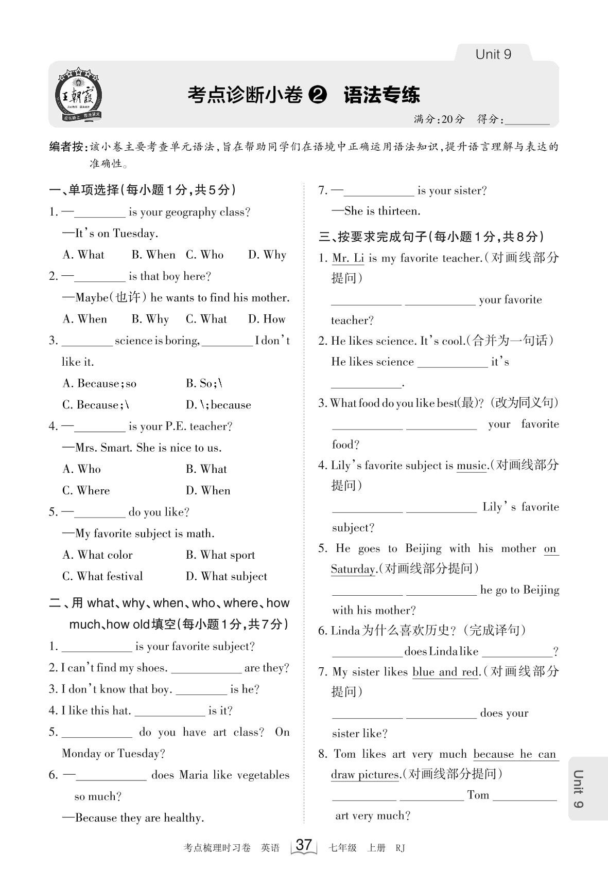 2023上册七年级英语人教版 Unit 9 考点诊断小卷2 语法专练