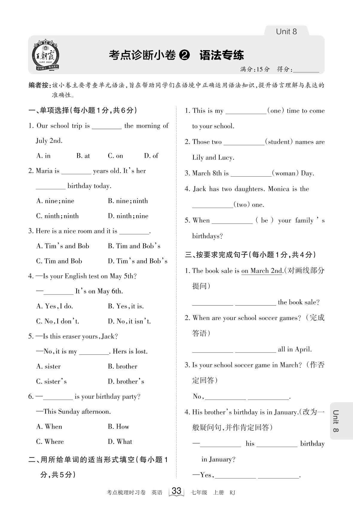 2023上册七年级英语人教版 Unit 8 考点诊断小卷2 语法专练