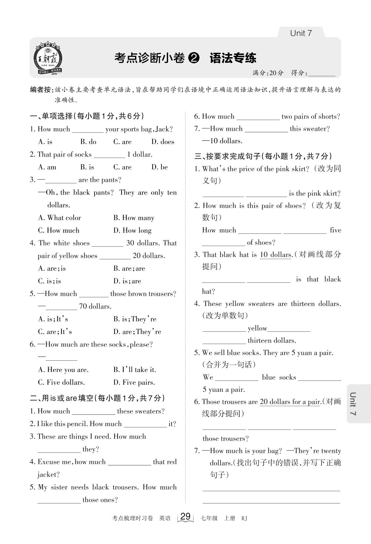 2023上册七年级英语人教版 Unit 7 考点诊断小卷2 语法专练