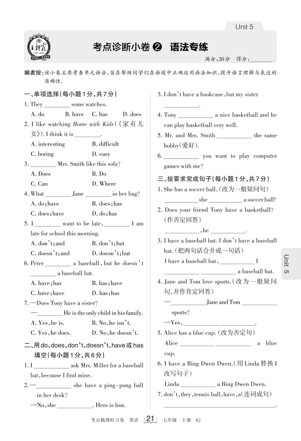 2023上册七年级英语人教版 Unit 5 考点诊断小卷2 语法专练