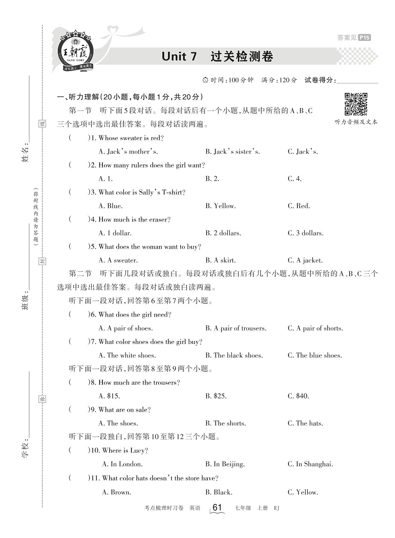 2023上册七年级英语人教版 Unit 7 过关检测卷