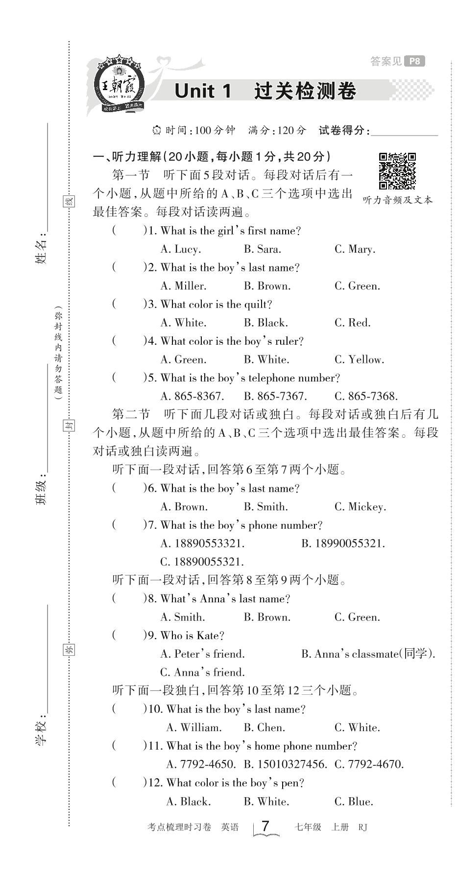 2023上册七年级英语人教版 Unit 1 过关检测卷