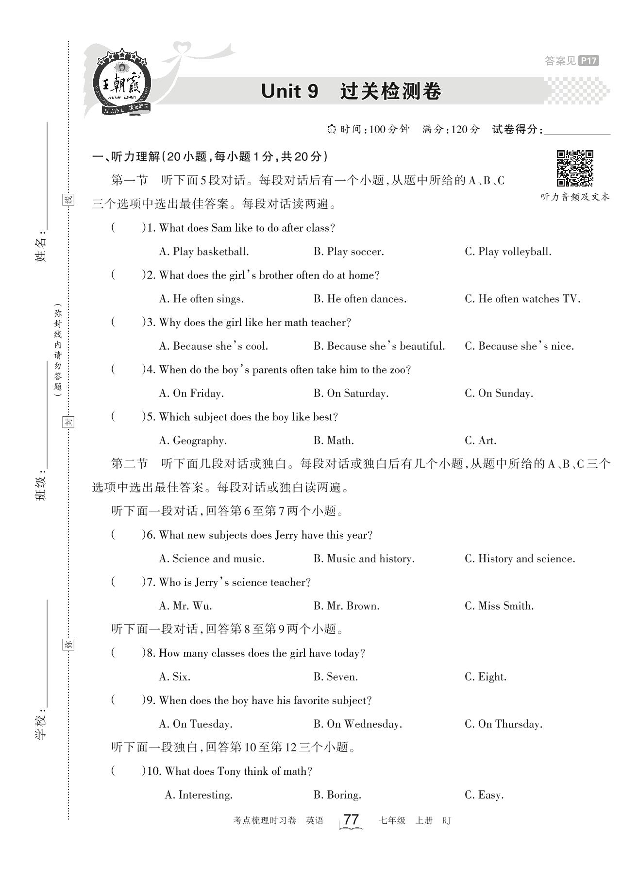 七年级英语人教版上册单元卷