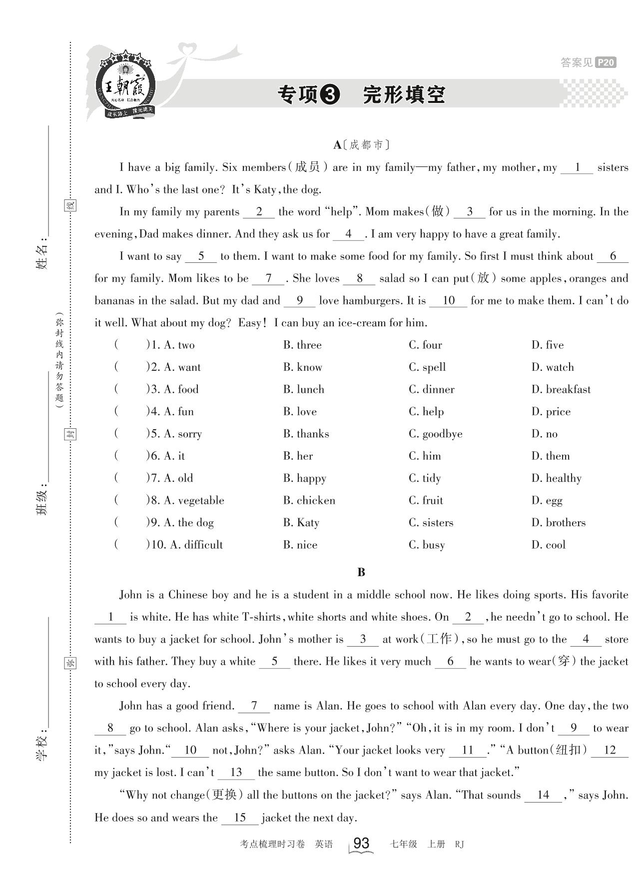 2023上册七年级英语人教版 专项3 完形填空