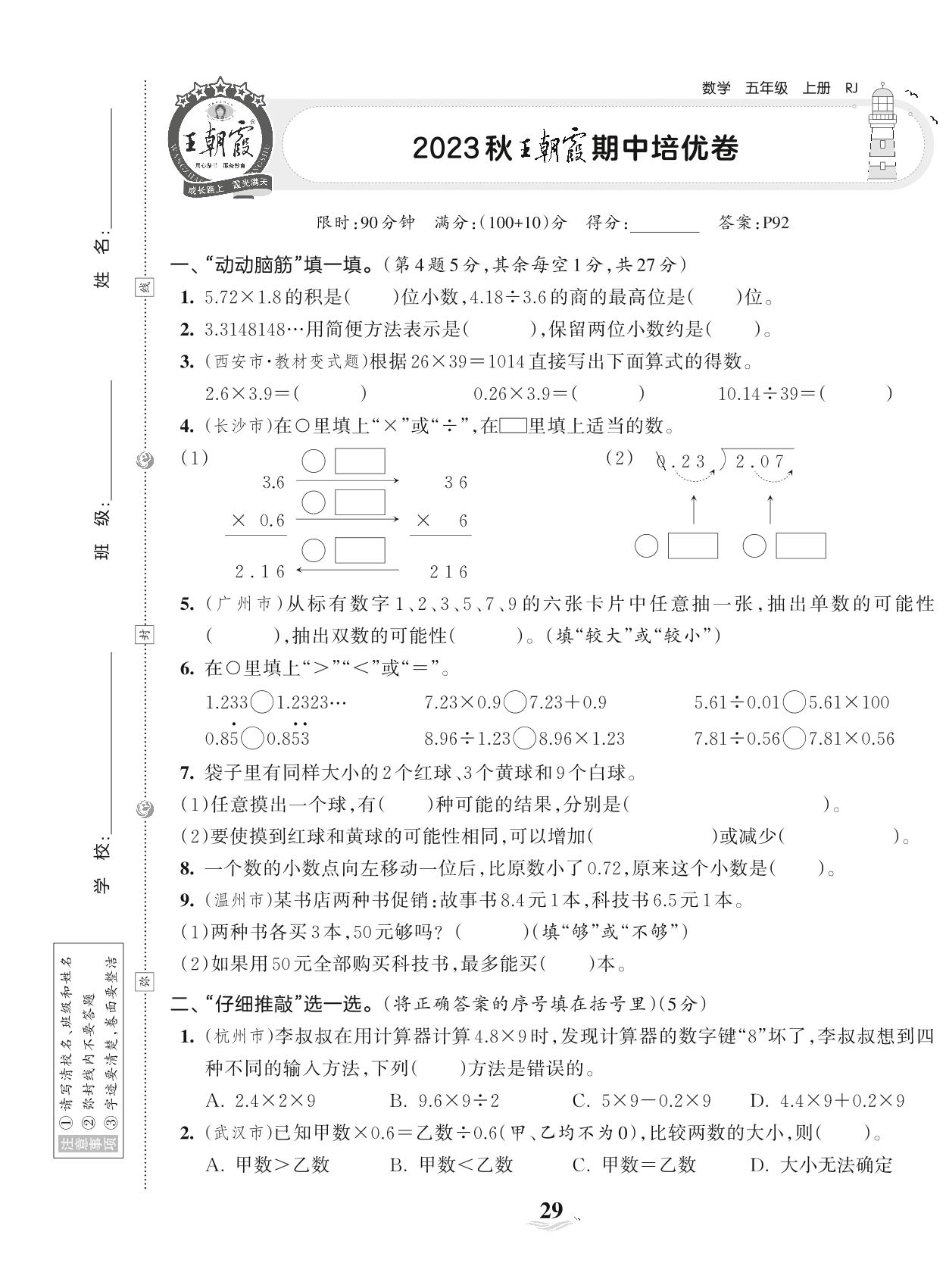2023上册五年级数学人教版 2023秋王朝霞期中培优卷