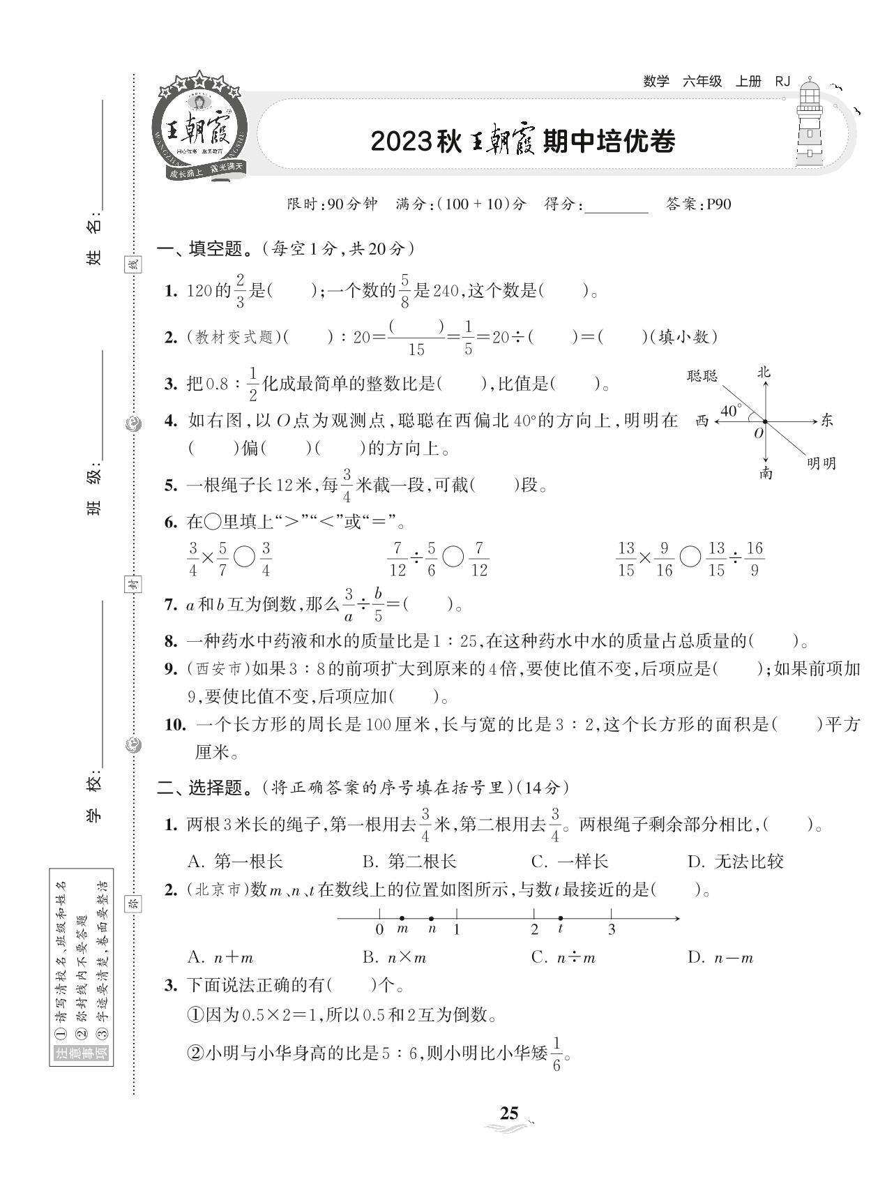 2023上册六年级数学人教版 2023秋王朝霞期中培优卷