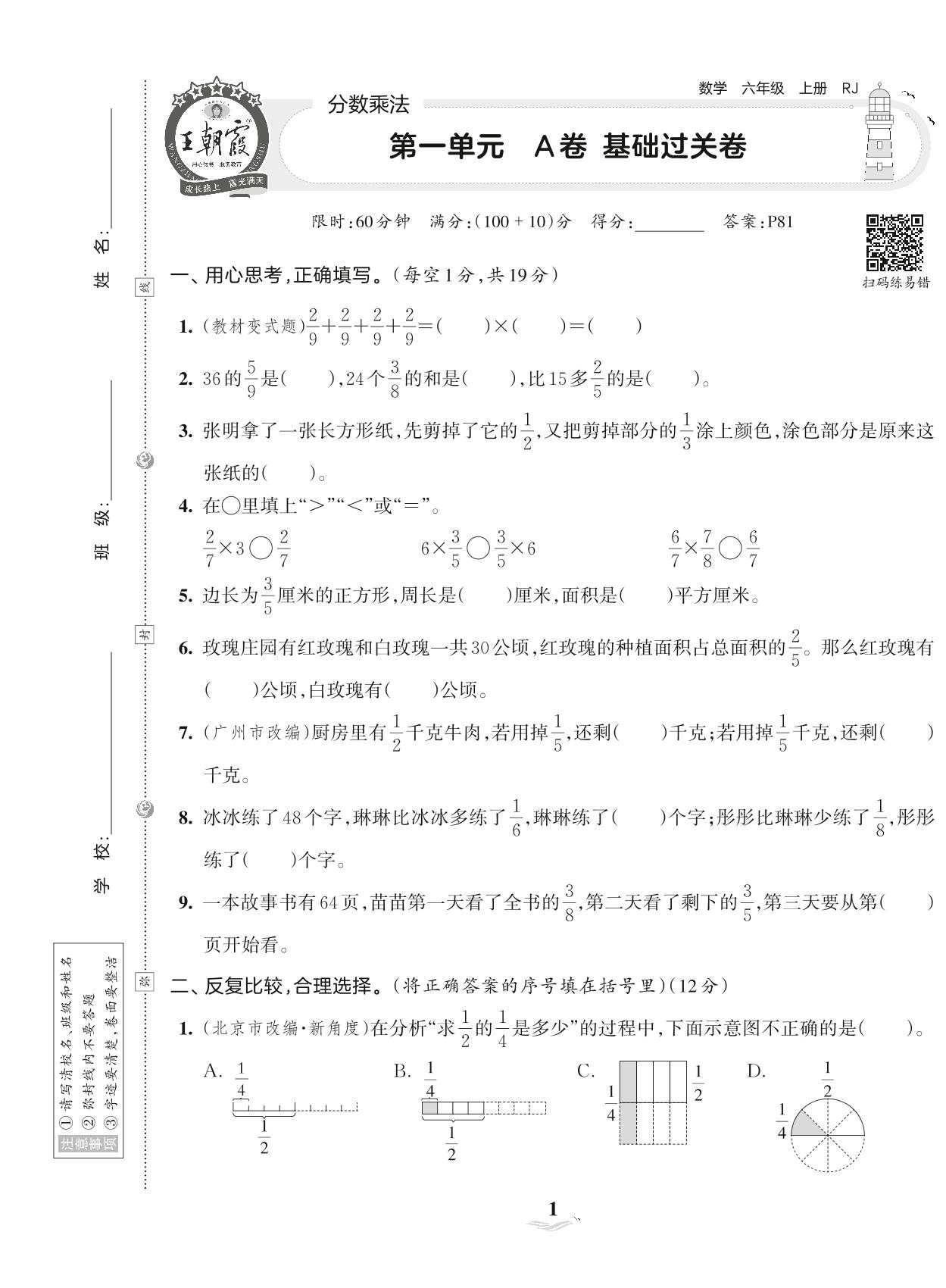2023上册六年级数学人教版 第一单元 A卷 基础过关卷