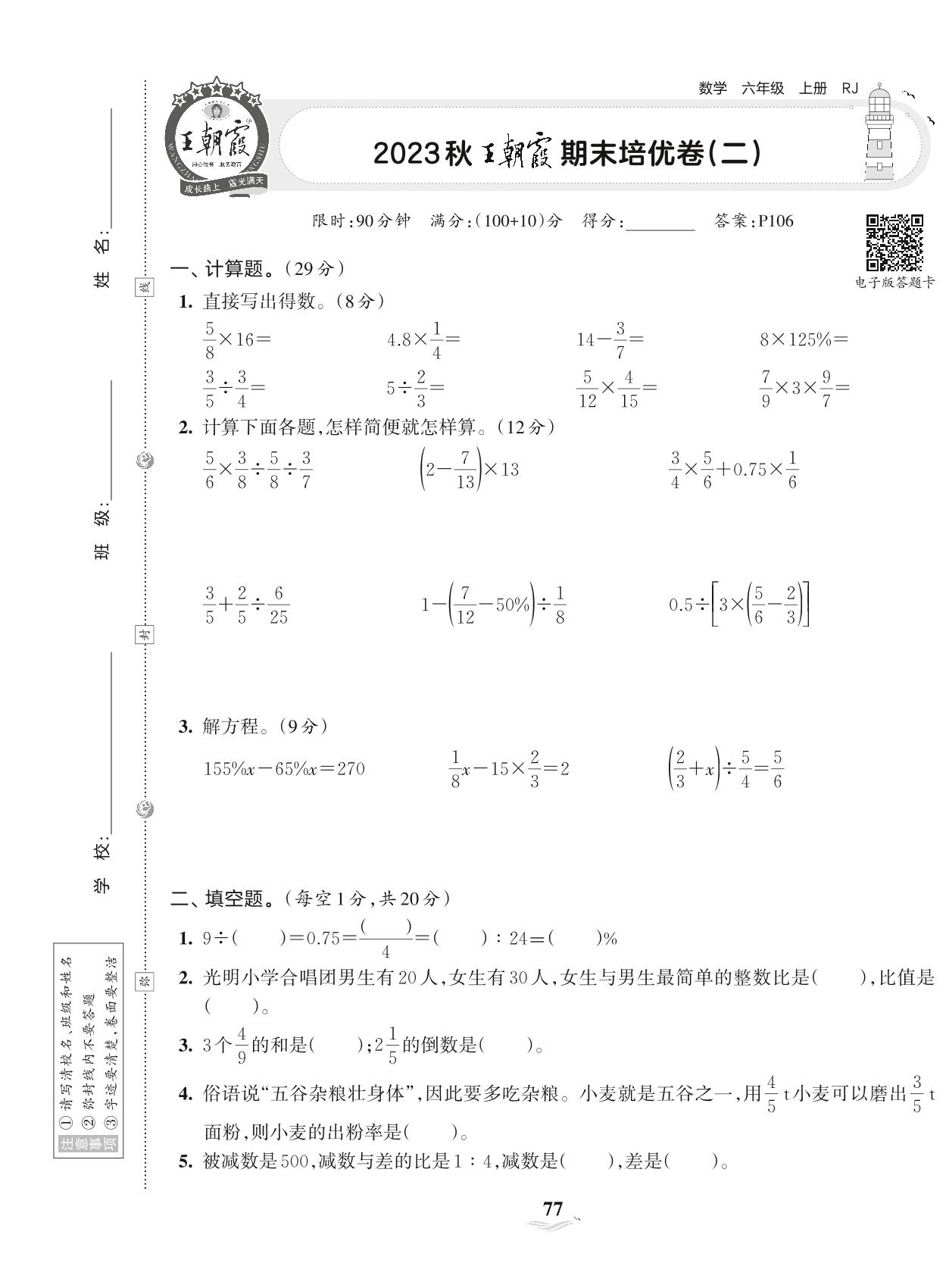 2023上册六年级数学人教版 2023秋王朝霞期末培优卷(二)