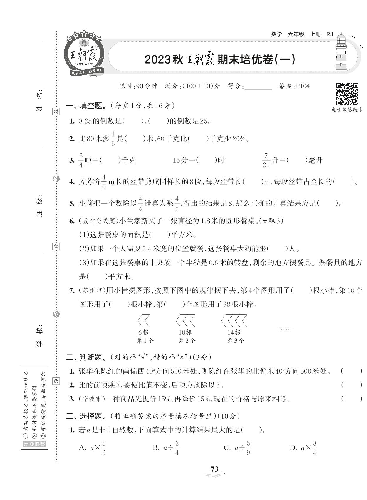 2023上册六年级数学人教版 2023秋王朝霞期末培优卷(一)