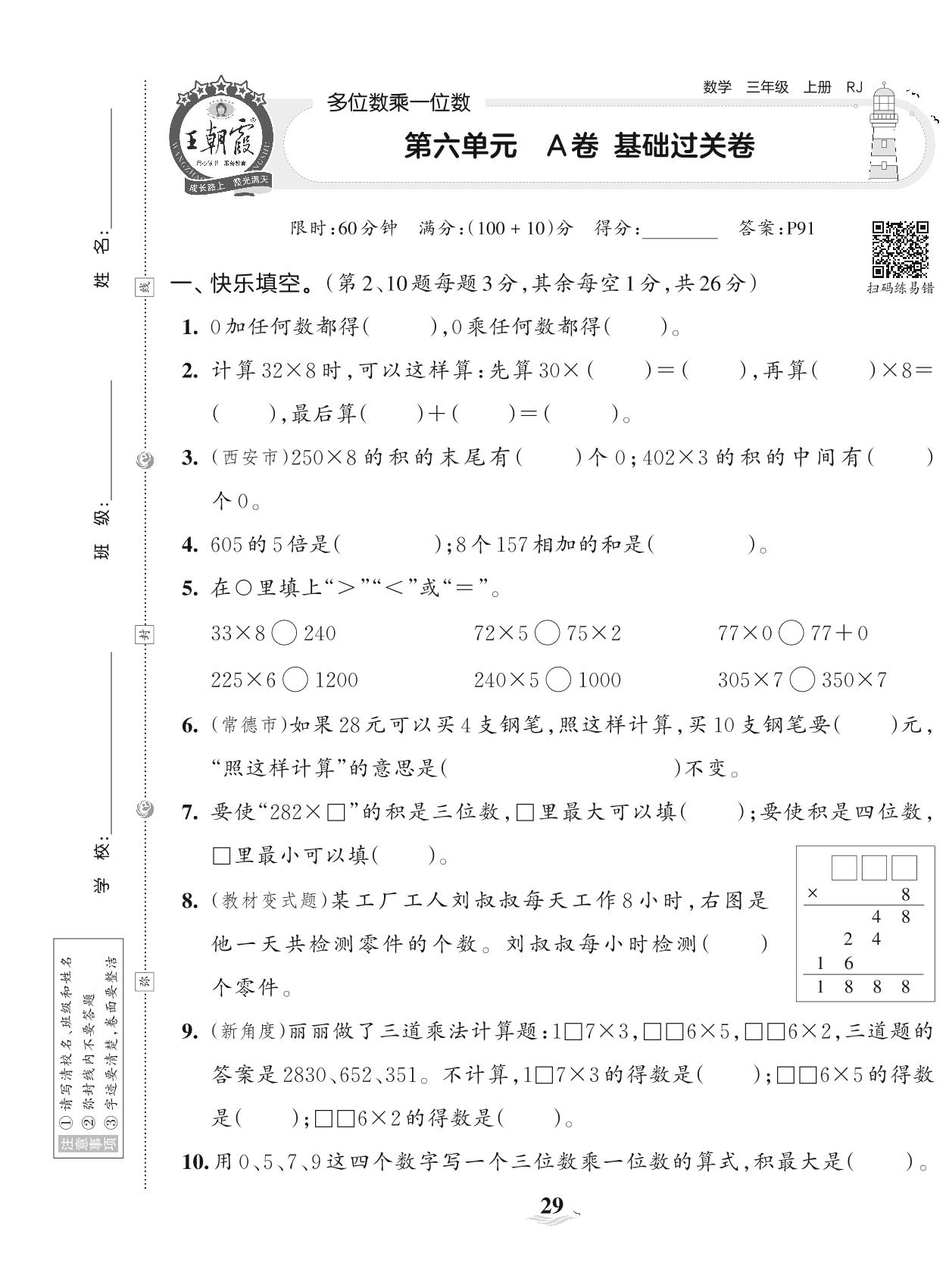 2023上册三年级数学人教版 第六单元 A卷 基础过关卷
