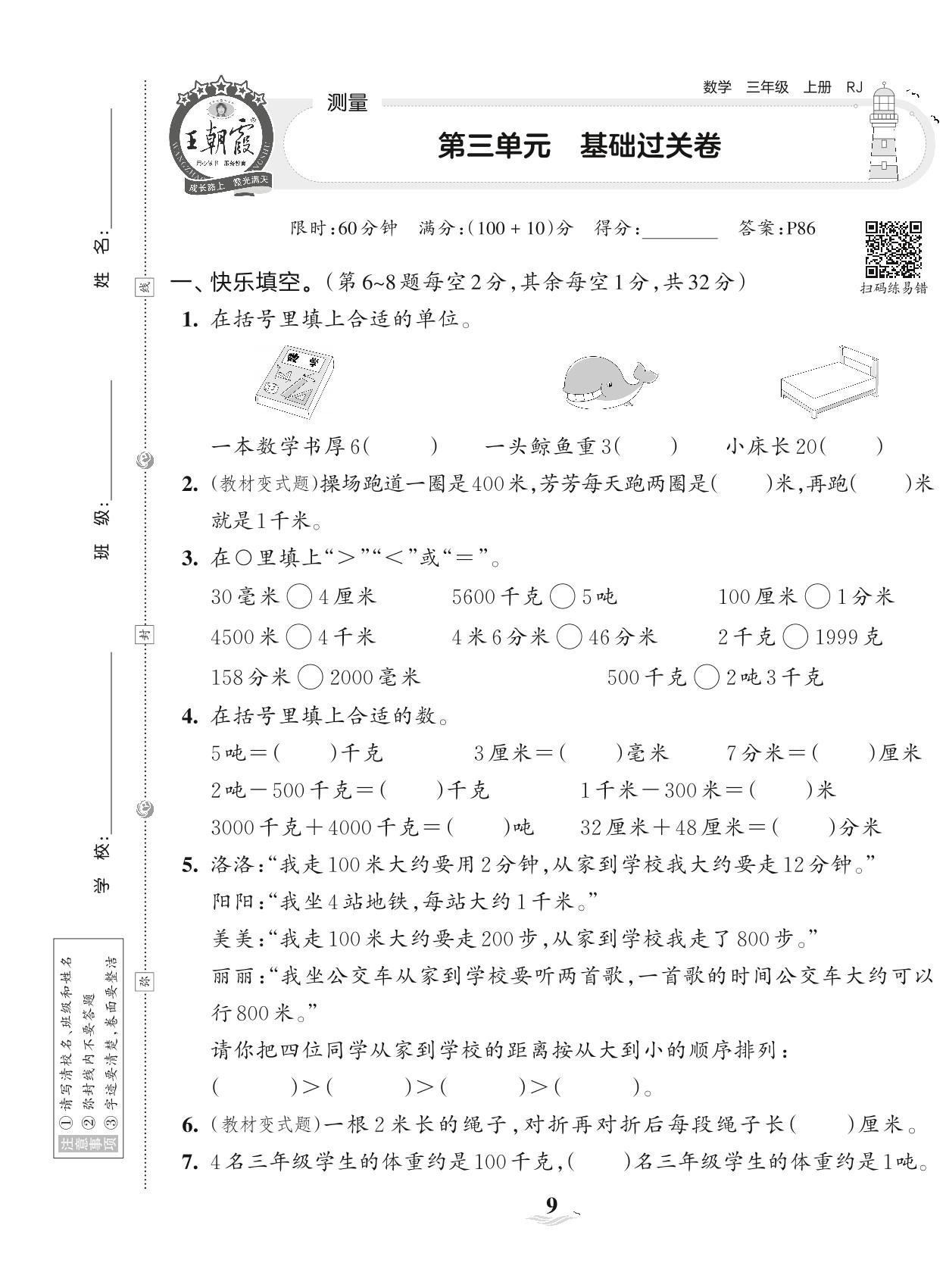2023上册三年级数学人教版 第三单元 基础过关卷