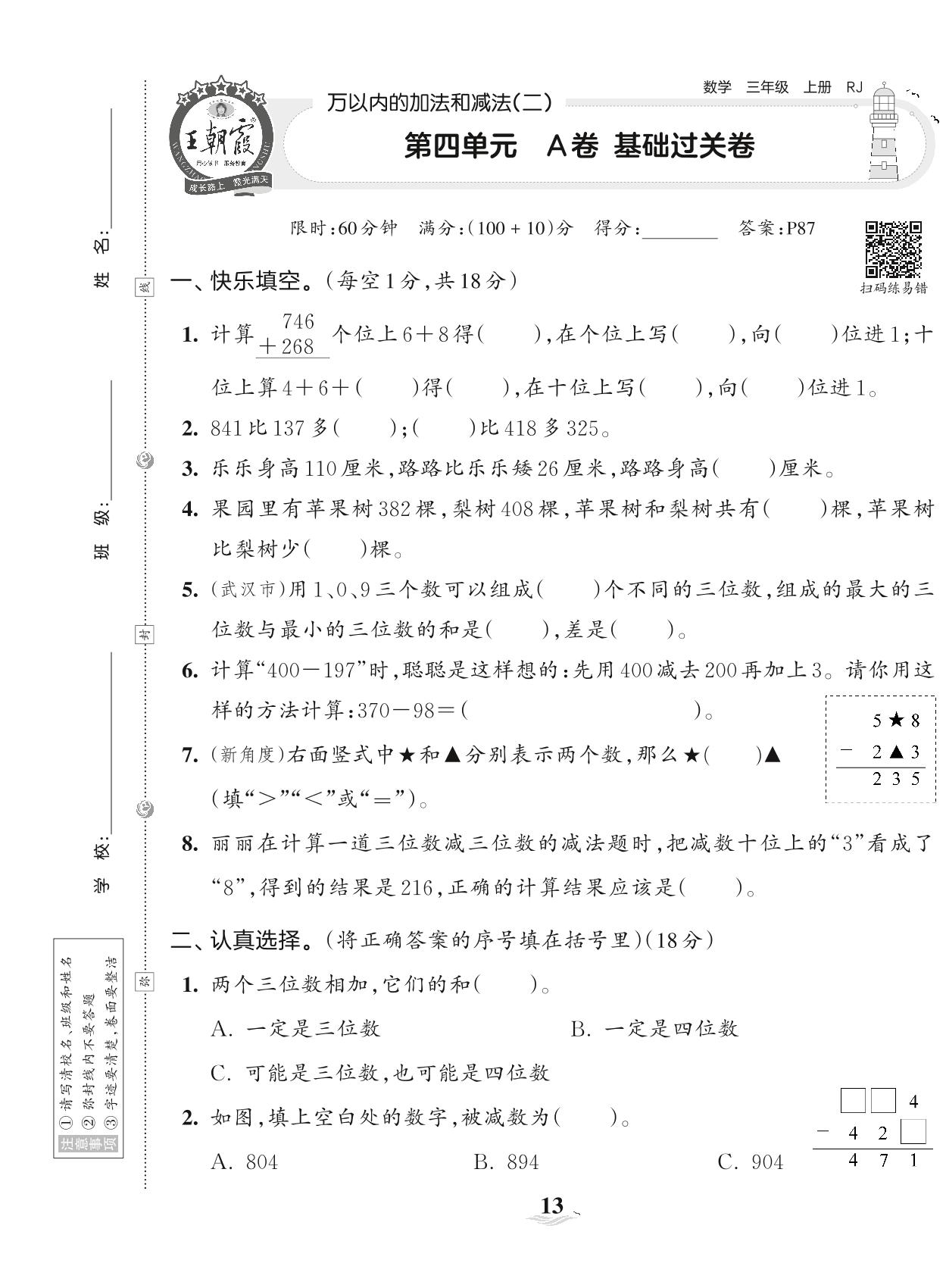 2023上册三年级数学人教版 第四单元 A卷 基础过关卷