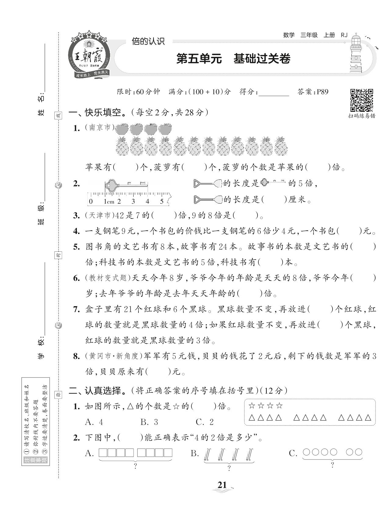 2023上册三年级数学人教版 第五单元 基础过关卷
