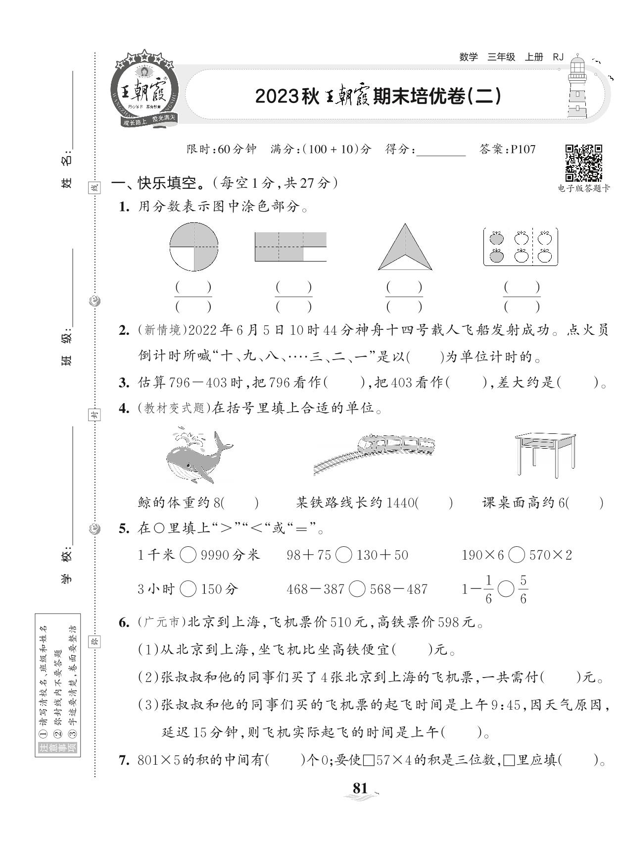 2023上册三年级数学人教版 2023秋王朝霞期末培优卷(二)