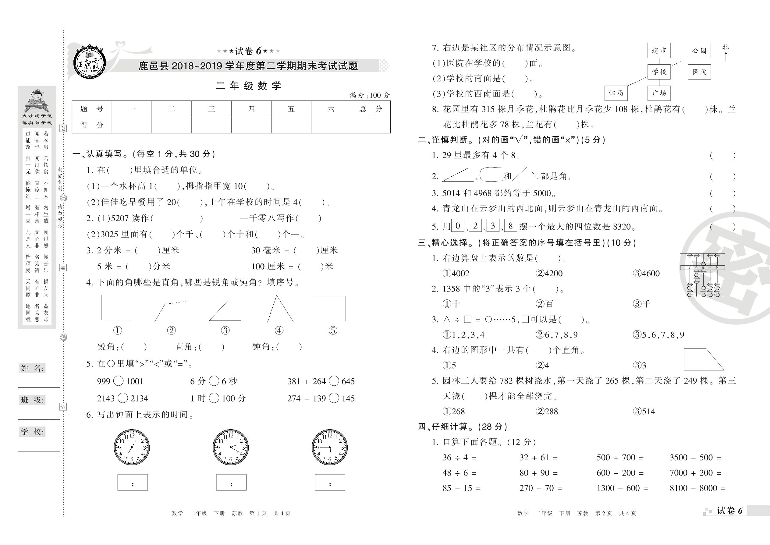 2018-2019学年第二学期周口市鹿邑县二年级数学试卷(苏教版)【6】
