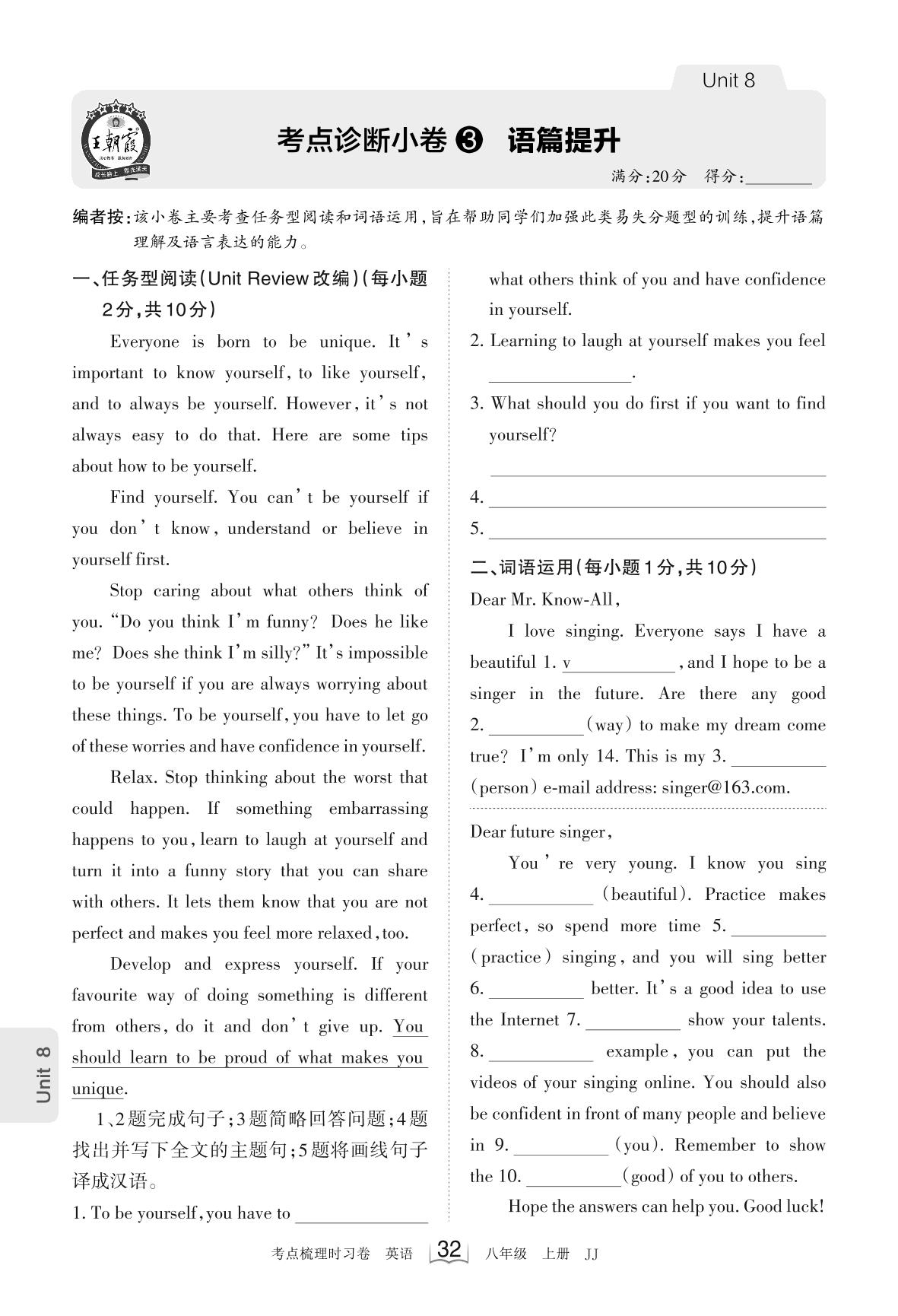 2023上册八年级英语冀教版 Unit 8 考点诊断小卷3 语篇提升