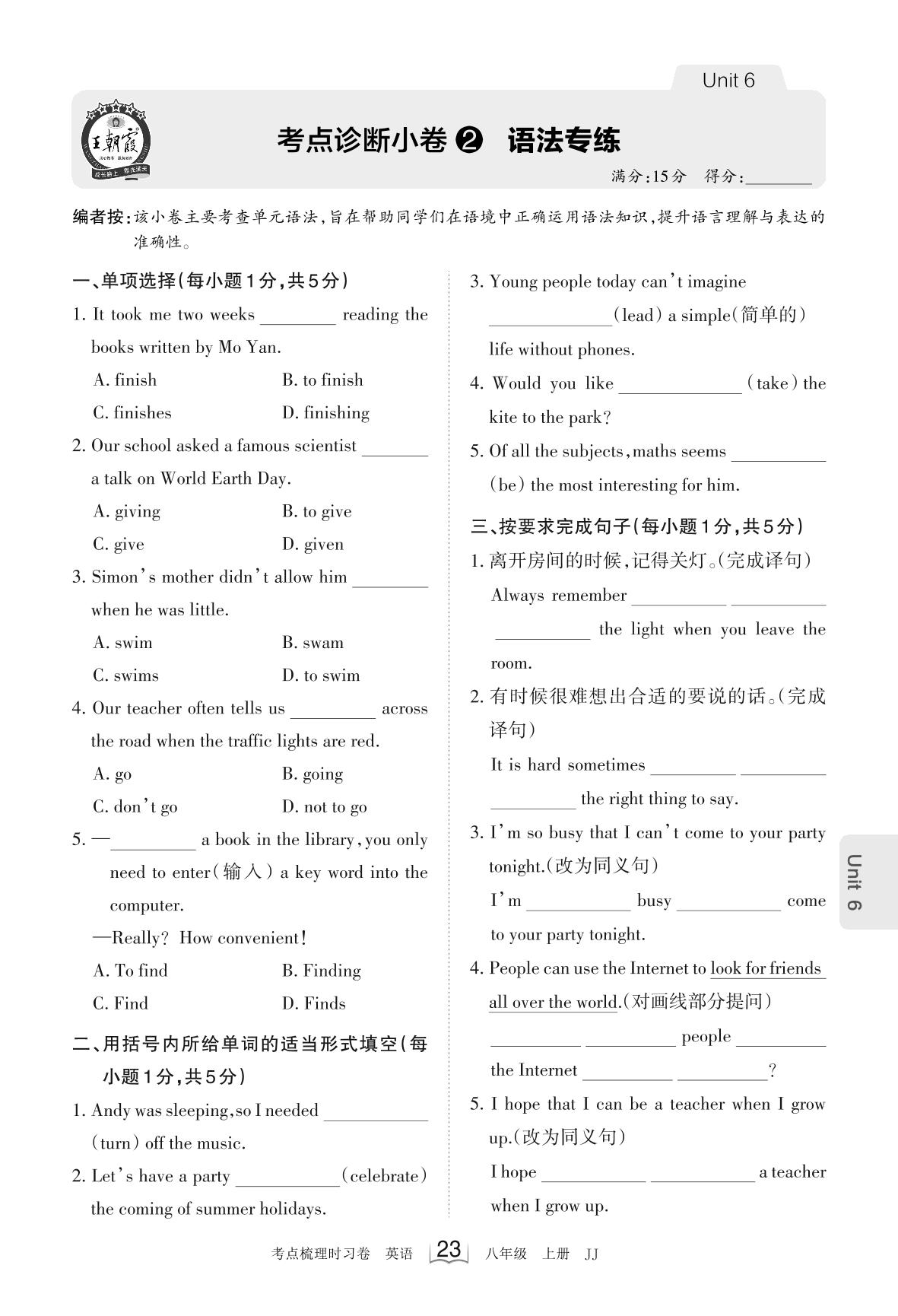 2023上册八年级英语冀教版 Unit 6 考点诊断小卷2 语法专练