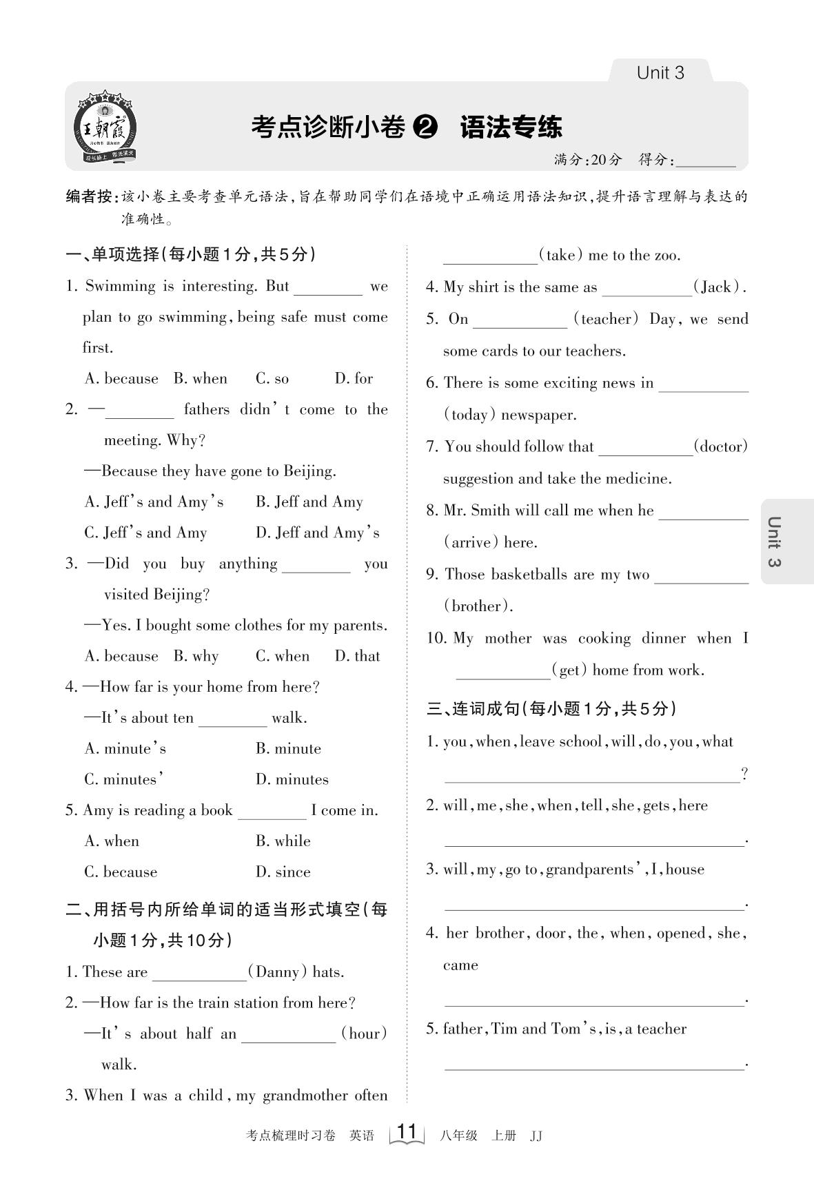 2023上册八年级英语冀教版 Unit 3 考点诊断小卷2 语法专练