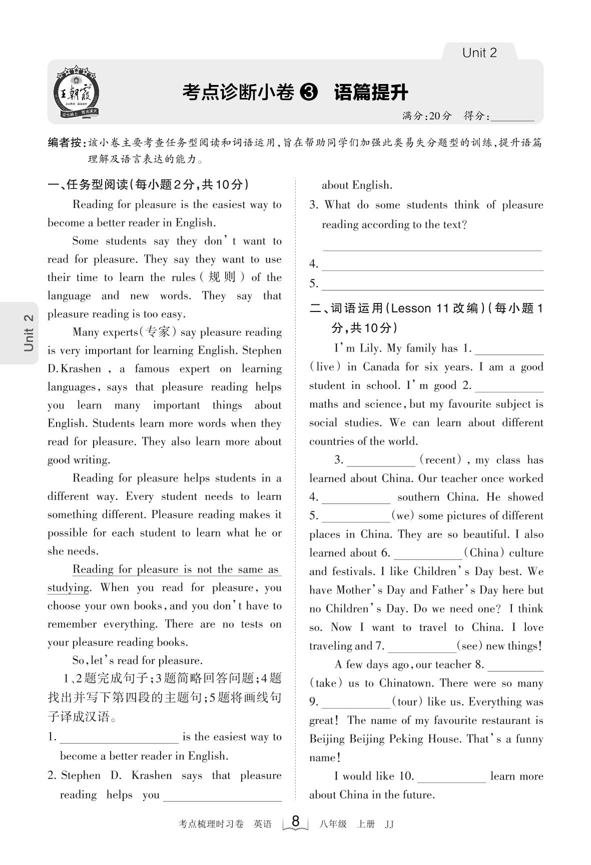 2023上册八年级英语冀教版 Unit 2 考点诊断小卷3 语篇提升