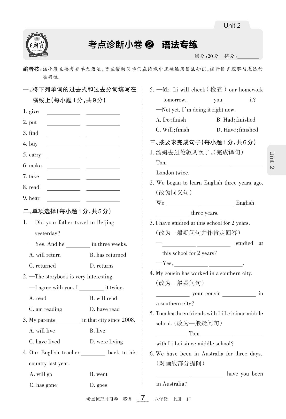 2023上册八年级英语冀教版 Unit 2 考点诊断小卷2 语法专练