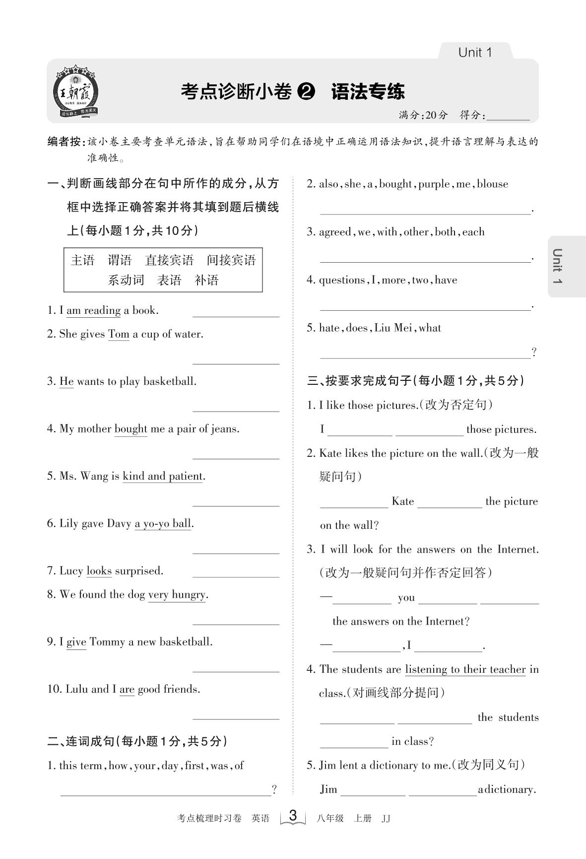 2023上册八年级英语冀教版 Unit 1 考点诊断小卷2 语法专练