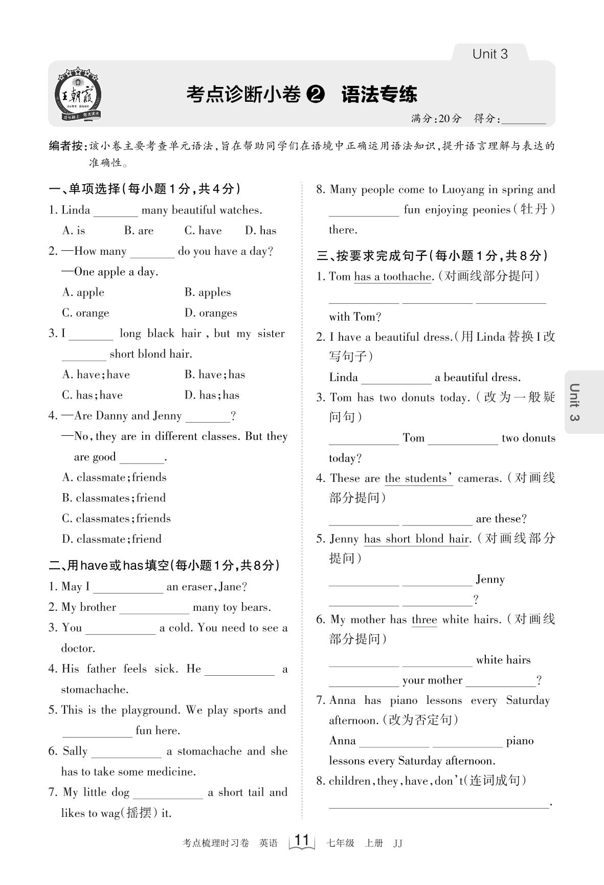 2023上册七年级英语冀教版 Unit 3 考点诊断小卷2 语法专练