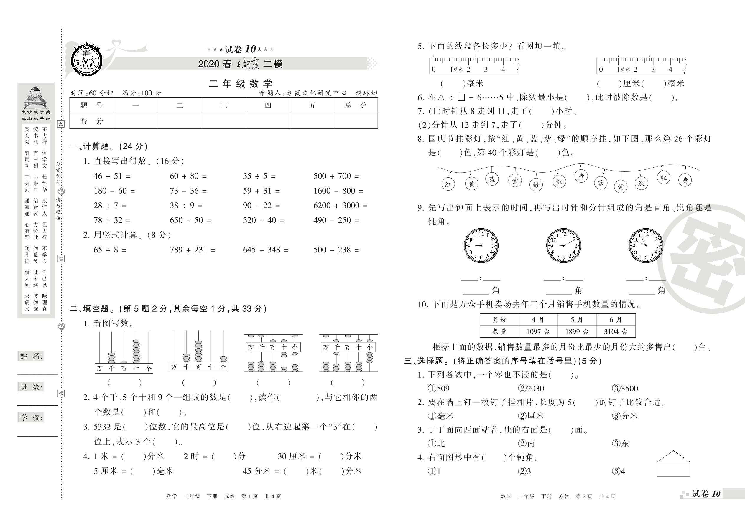 王朝霞期末模拟卷二年级下册数学(苏教版)_R21080392029【10】