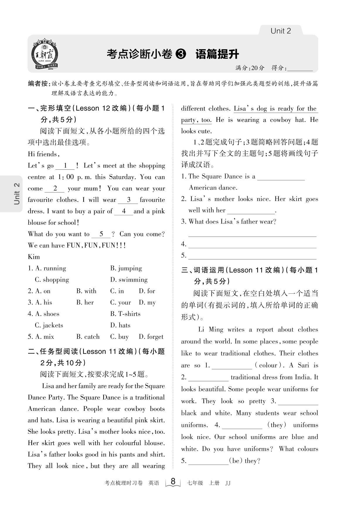 2023上册七年级英语冀教版 Unit 2 考点诊断小卷3 语篇提升