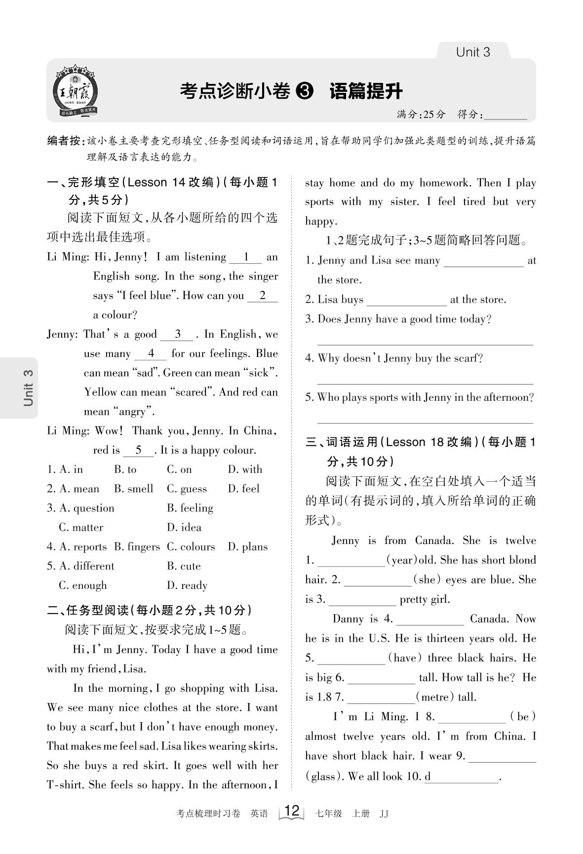 2023上册七年级英语冀教版 Unit 3 考点诊断小卷3 语篇提升