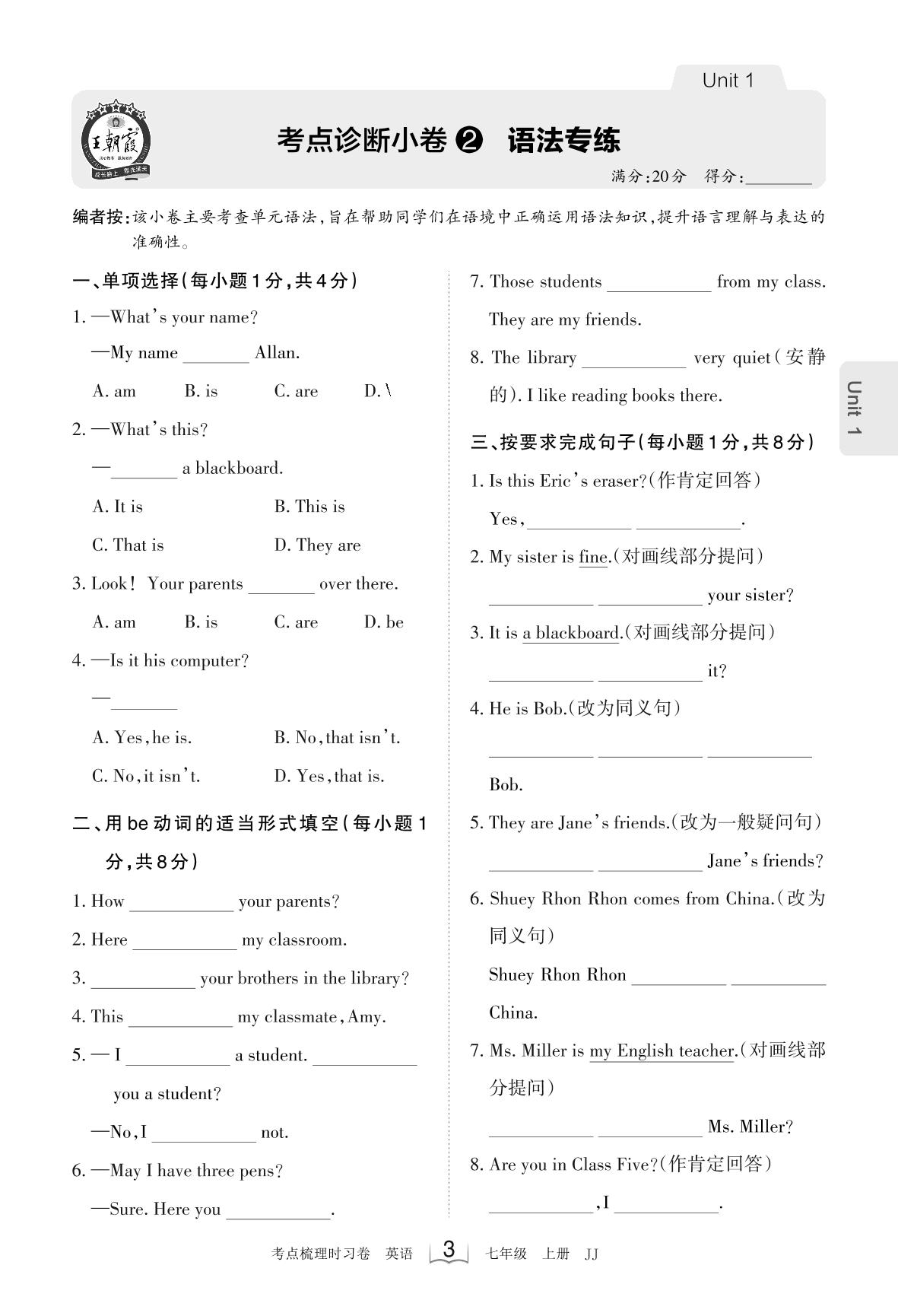 2023上册七年级英语冀教版 Unit 1 考点诊断小卷2 语法专练