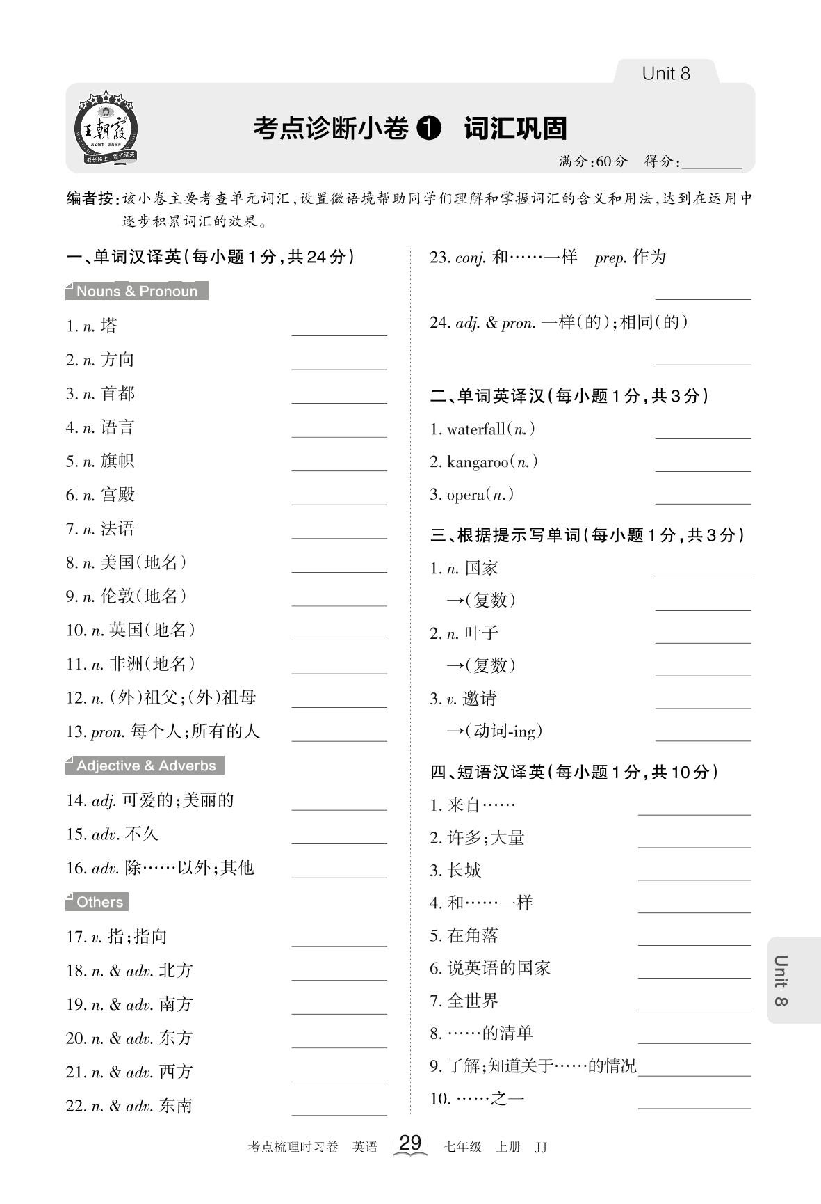2023上册七年级英语冀教版 Unit 8 考点诊断小卷1 词汇巩固