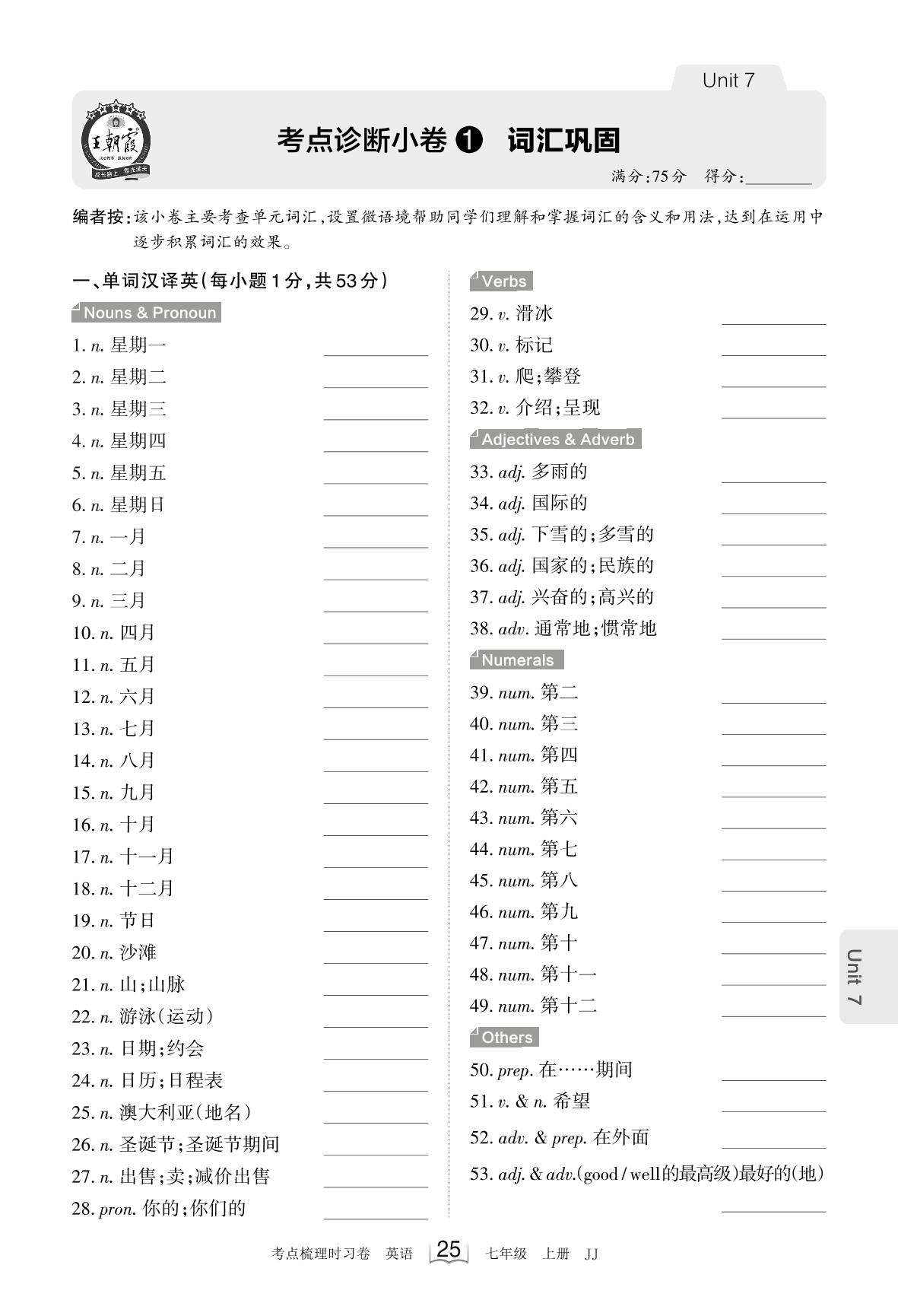 2023上册七年级英语冀教版 Unit 7 考点诊断小卷1 词汇巩固