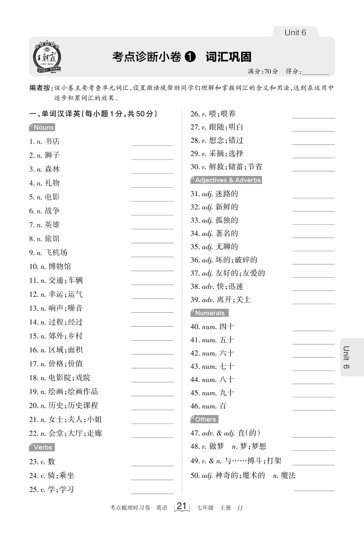 2023上册七年级英语冀教版 Unit 6 考点诊断小卷1 词汇巩固