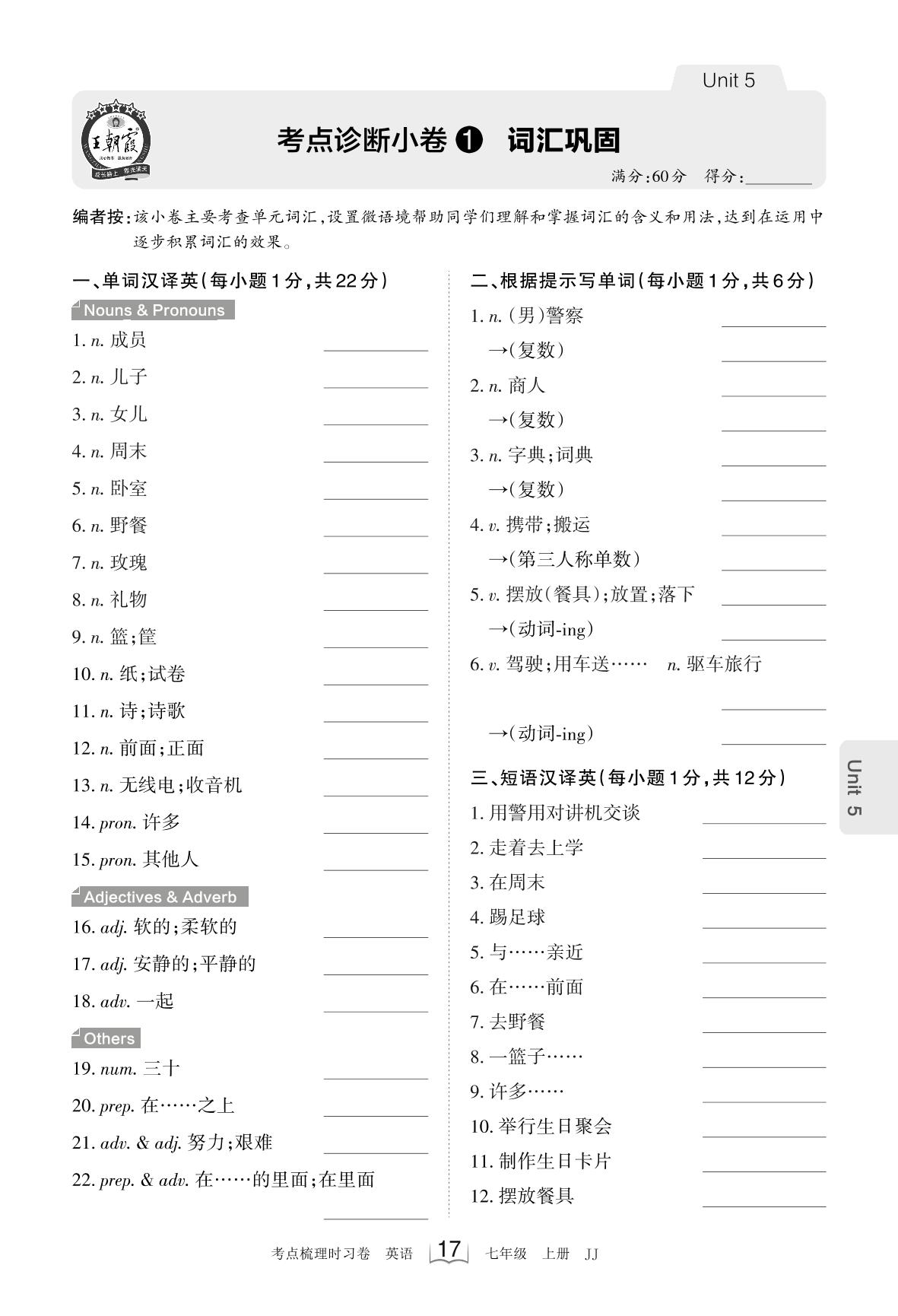 2023上册七年级英语冀教版 Unit 5 考点诊断小卷1 词汇巩固